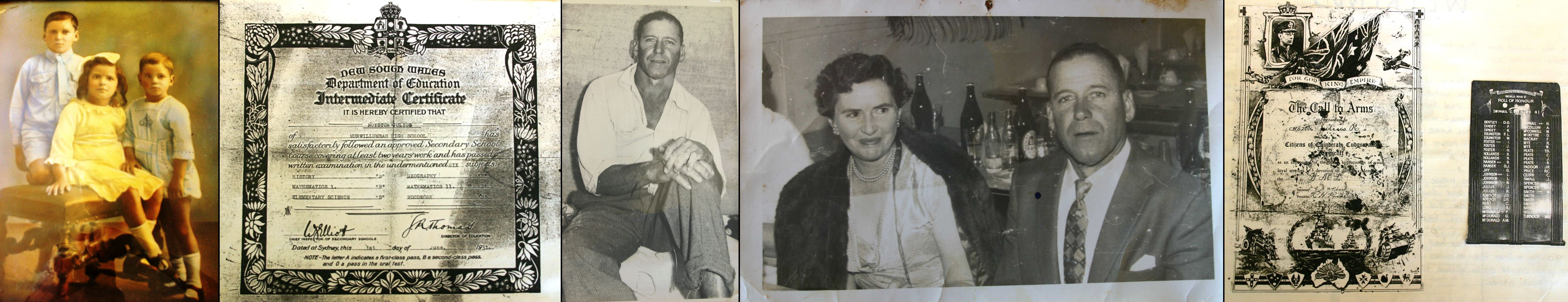 With his siblings in front Jean & John Francis, school leaving Certificate, on the farm and with Bonnie at a party, WWII service.