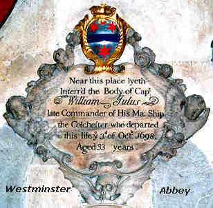 4. Capt William JULIUS R N [689] (John of St Kitts West Indies [691]1) was born in 1665, died on 3 Oct 1698 aged 33, and was buried on 6 Oct 1698 in Westminster Abbey London.