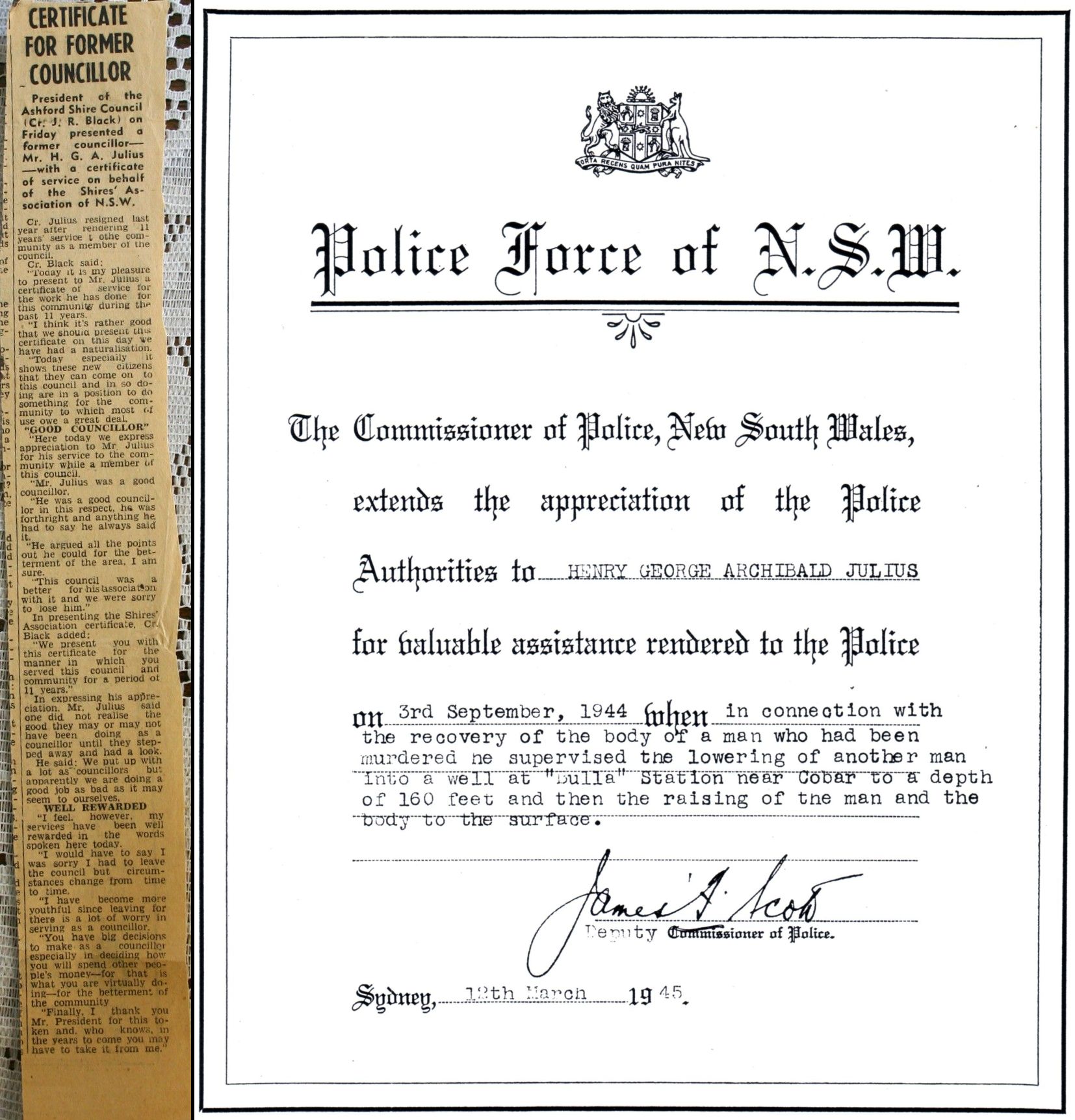 Mr Julius was a member of the Land Board where his knowledge was greatly valued and a Justice of the Peace for many years. He was greatly interested in his fellow man, and of a most generous disposition. He donated the recreation reserve to Cudgen and started the lower Tweed Pony Club being always a lover of horses. Patron of the Kingcliffe R.S.L. for 12(?) years and member of Tweed Historical Society represent some of his varied interests.