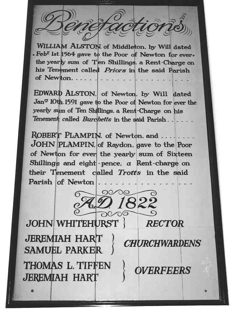 William Alston of Middleton, by Will dated Feb 1st 1564 gave to the poor of Newton for ever the yearly sum of Ten Shillings a Rent Charge on his Tenement called Priors in the said Parish of Newton . . . .