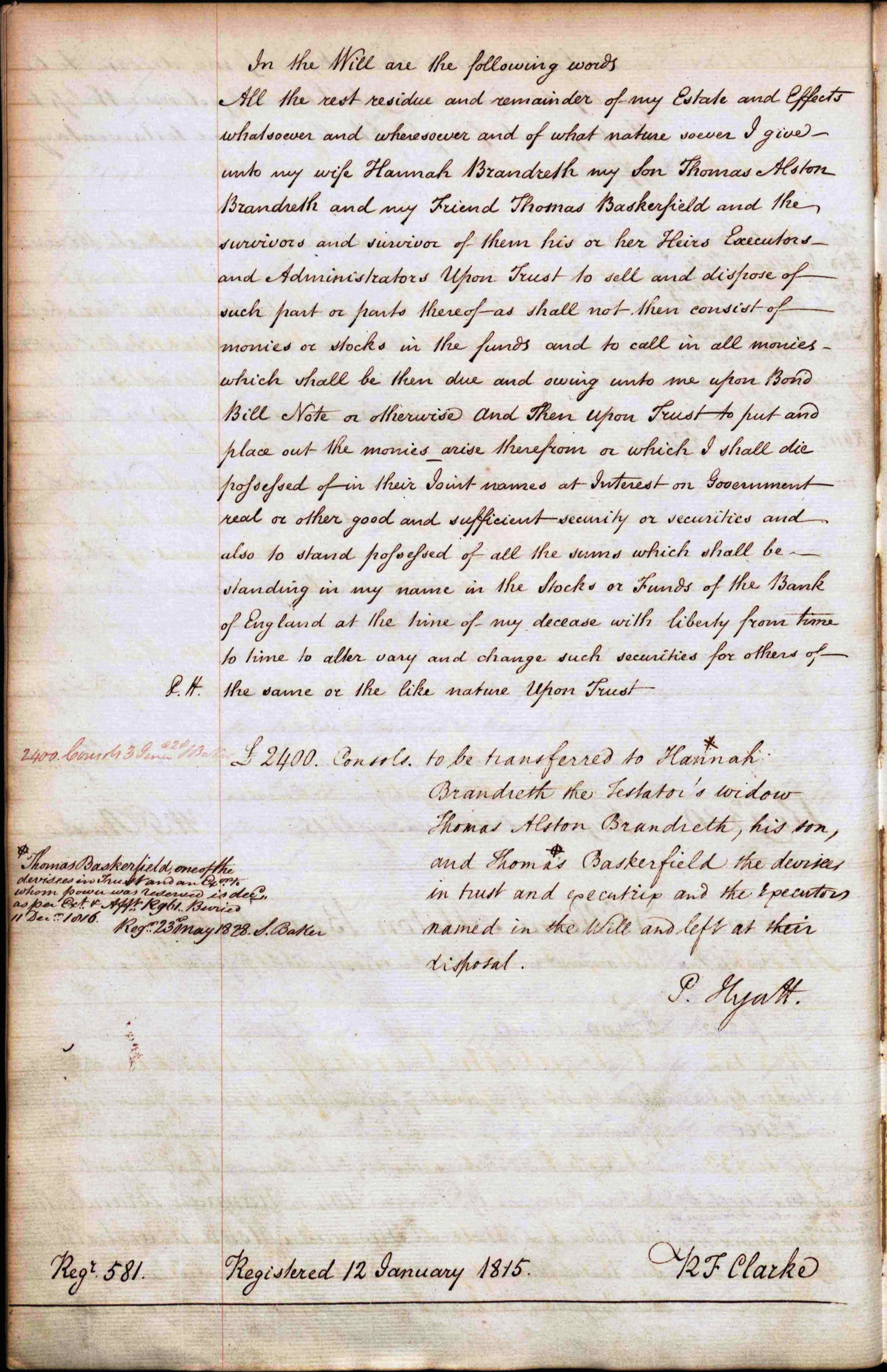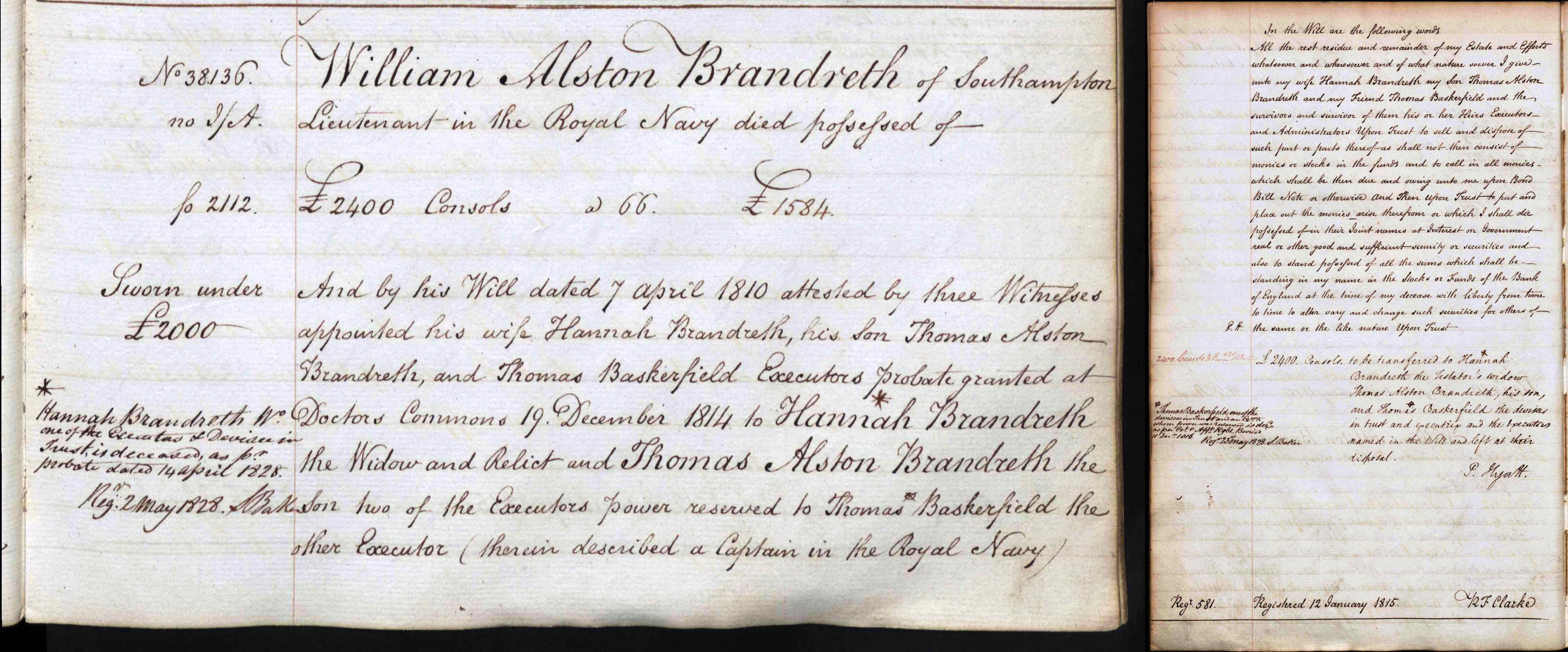 1. William Alston Brandreth: Extract of Will by Bank of England, 7 Apr 1810. Probate 19 Dec 1814.