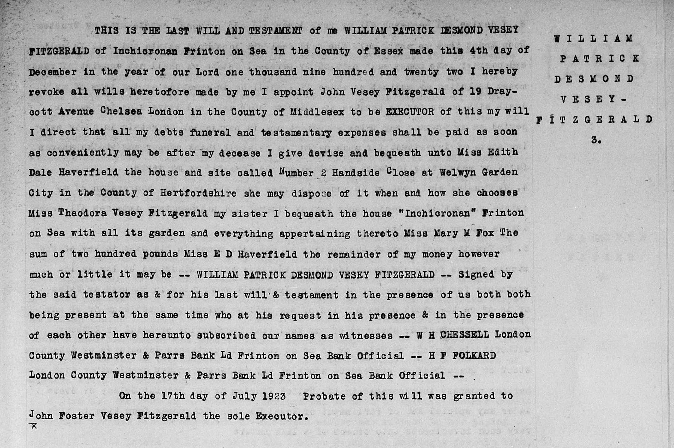 THIS IS THE LAST WILL AND TESTAMENT of me WILLIAM PATRICK DESMOND VESEY WILLIAM FITZGERALD of Inchioronan Frinton on Sea in the County of Essex made this 4th day of December in the year of our Lord one thousand nine hundred and twenty two I hereby revoke all wills heretofore made by me I appoint John Vesey Fitzgerald of 19 Draycott Avenue Chelsea London in the County of Middlesex to be EXECUTOR of this my will I direct that all my debts funeral and testamentary expenses shall be paid as soon as conveniently may be after my decease I give devise and bequeath unto Miss Edith Dale Haverfield the house and site called Number 2 Handside Close at Welwyn Garden City in the County of Hertfordshire she may dispose of it when and how she chooses Miss Theodora Vesey Fitzgerald my sister I bequeath the house "Inchicronan" Frinton on Sea with all its garden and everything appertaining thereto Miss Mary M Fox The sum of two hundred pounds Miss E D Haverfield the remainder of my money however much or little it may be WILLIAM PATRICK DESMOND VESEY FITZGERALD Signed by the said testator as & for his last will.& testament in the presence of us both both being present at the same time who at his request in his presence & in the presence of each other have hereunto subscribed our names as witnesses W H CHESSELL London County Westminster & Parrs Bank Ltd Frinton on Sea Bank Official H P FOLKARD London County Westminster & Parrs Bank Ld Frinton on Sea Bank Official On the 17th day of July 1923 Probate of this will was granted to John Foster Vesey Fitzgerald the sole Executor.