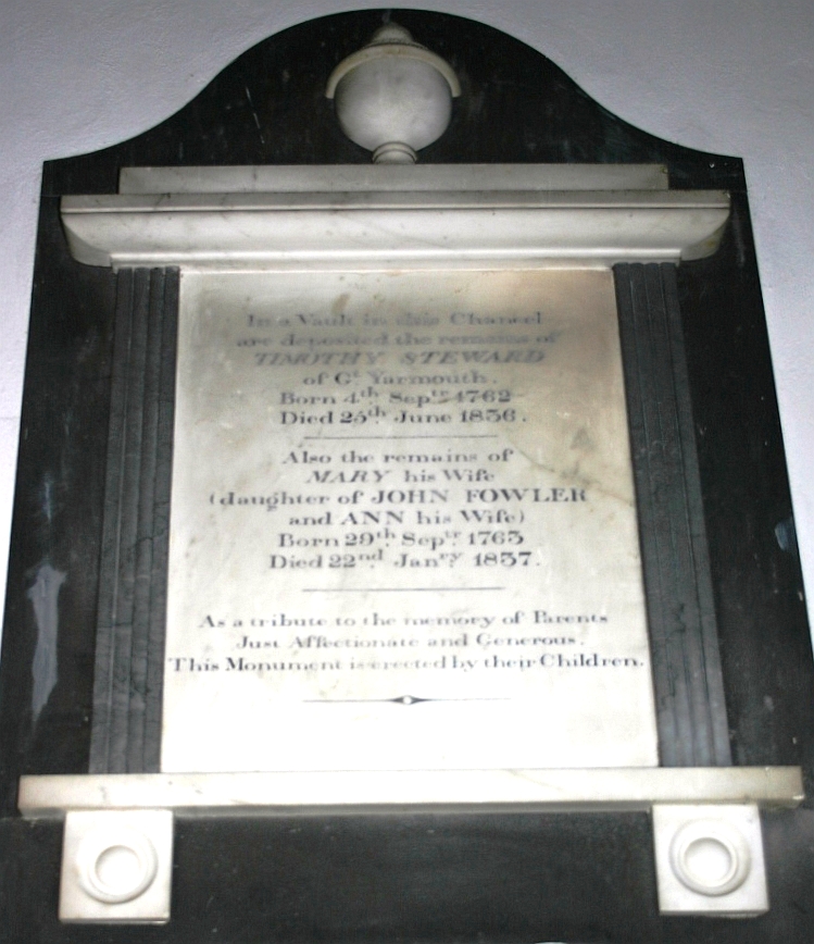 Timothy Stewart Esq.,was a merchant and shipowner. He possessed some of the fastest vessels belonging to the port, they were much in request before the introduction of steam to take cargoes of herrings to the Mediterranean and bring back fruit. They were both buried in Blundeston Church. There is a portrait of Mr. Steward, when a young man, by Sir William Beechy. There is also a portrait of him by Davis. (ref: Palmers Perlustration)