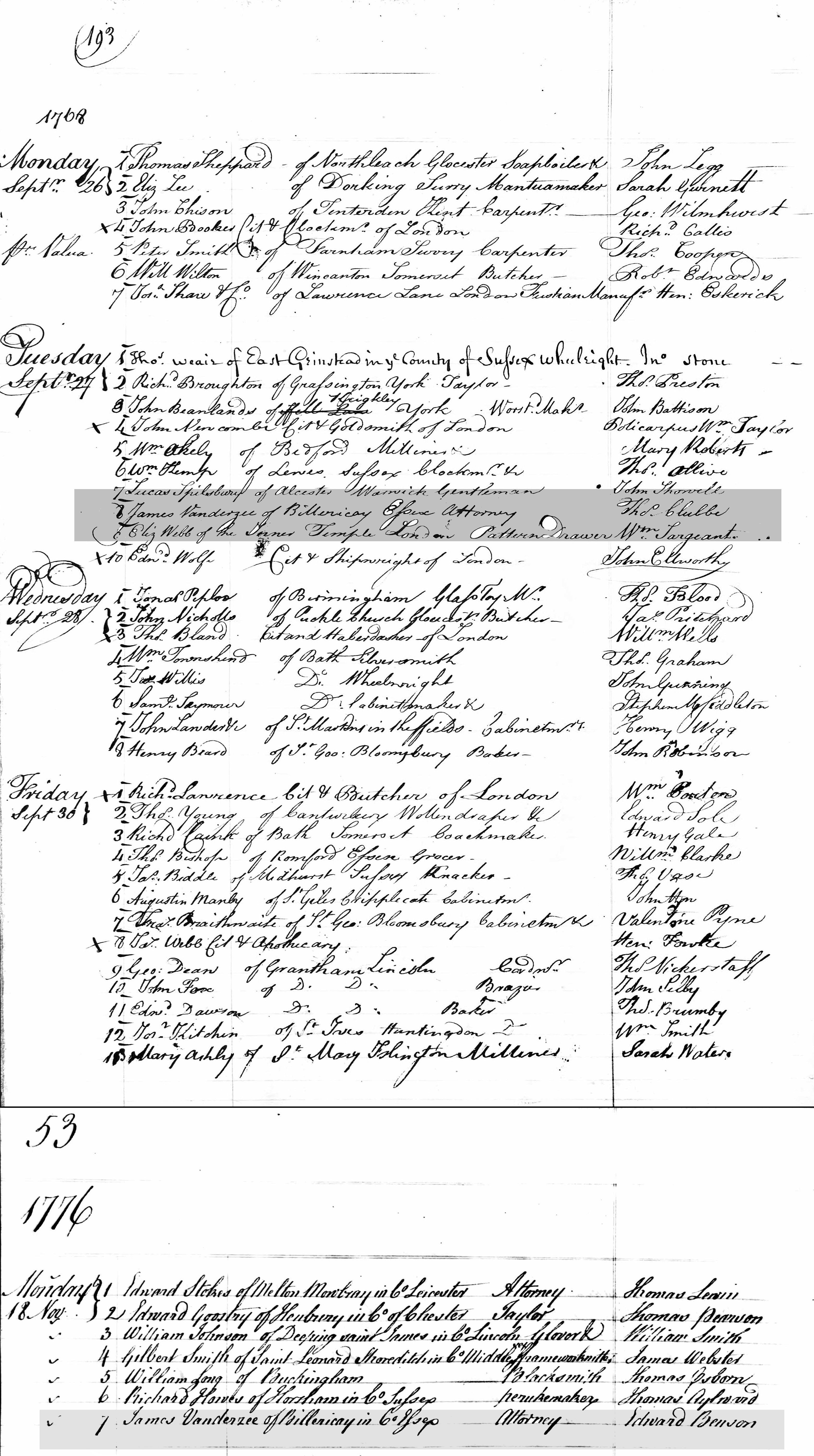 James Vanderzee attorney of Billericay Master, Apprentice Thomas Clubbe, date of Indenture 31 Aug 1768, date of Duty 27 Sep 1768, Term 5 years, Fee L105.0.0 Ref:The Genealogist IR 1/25