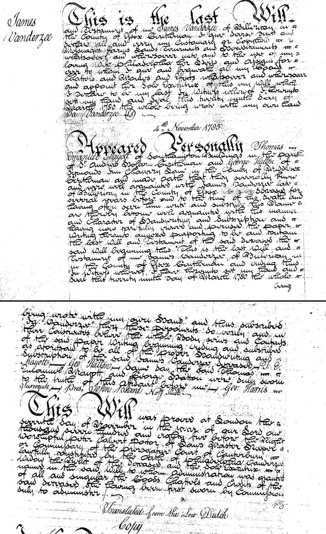 1. James Vanderzee: Will, 29 Mar 1780, Billericay ESS. The Will of James Vanderzee of Billericay Gent. Dated 29 Mar 1780 This is the last Will and Testament of me James Vanderzee of Billercay in the County of Essex Gentleman. I give devise divest and declare all and every my customary and copyhold messuages, farms, lands, tenements and hereditaments whatsoever and wheresoever unto and to the use of my loving wife Philadelphia her heirs and assigns for ever to whom I give and bequeath all my goods chattles moneys effects whatsoever and wheresoever and appoint her sole executrix of this my will which I declare to be my last In Witness hereof I hereunto sett my hand and seal this 29th day of March 1780 James Alston 4 Nov 1785 Appeared personally Thomas Emmanuel Mayott, . . . . . and George Hatton . . . . . who were acquainted with the manner and character of James Vanderzee's handwriting testified to the authenticity of the Will