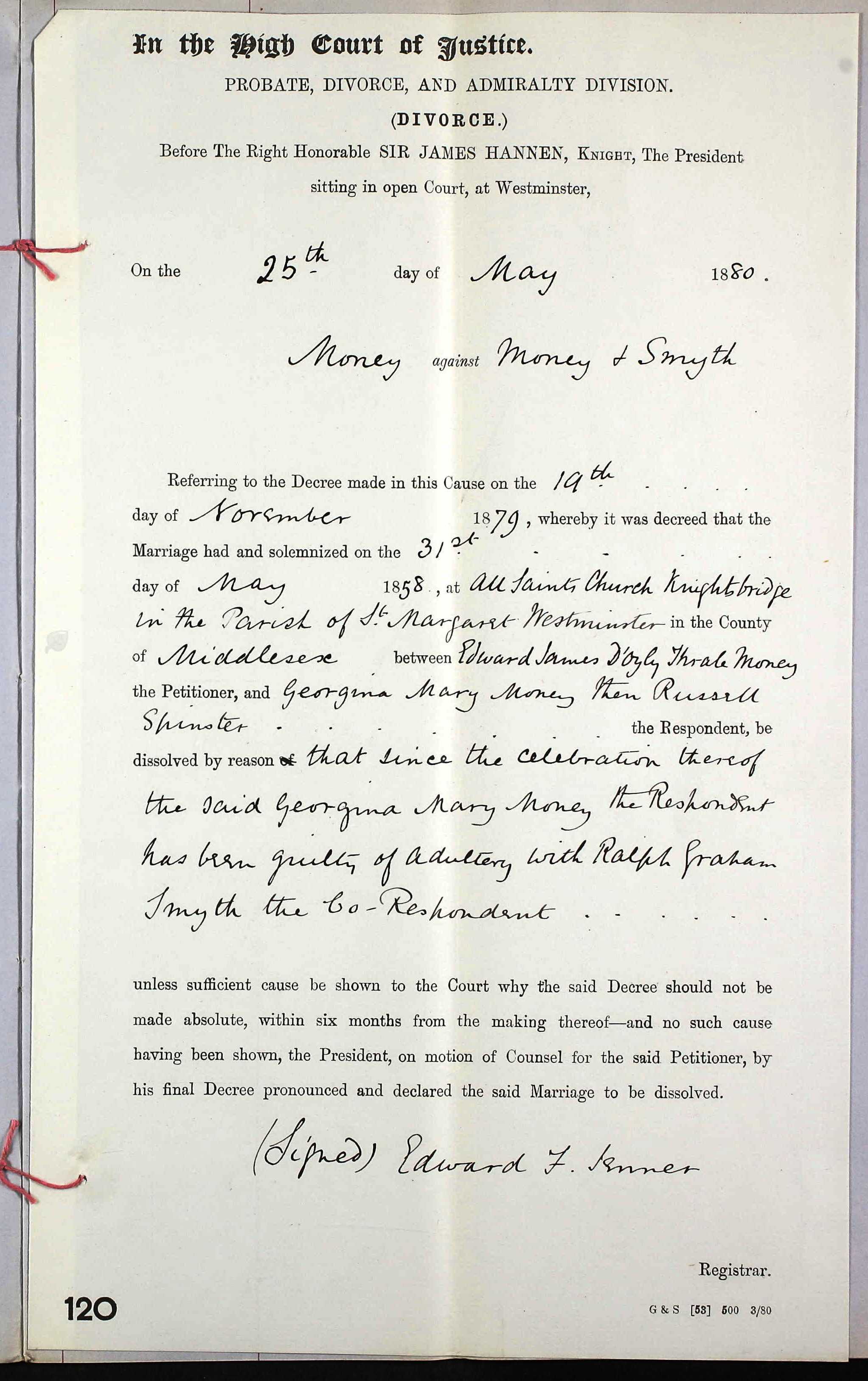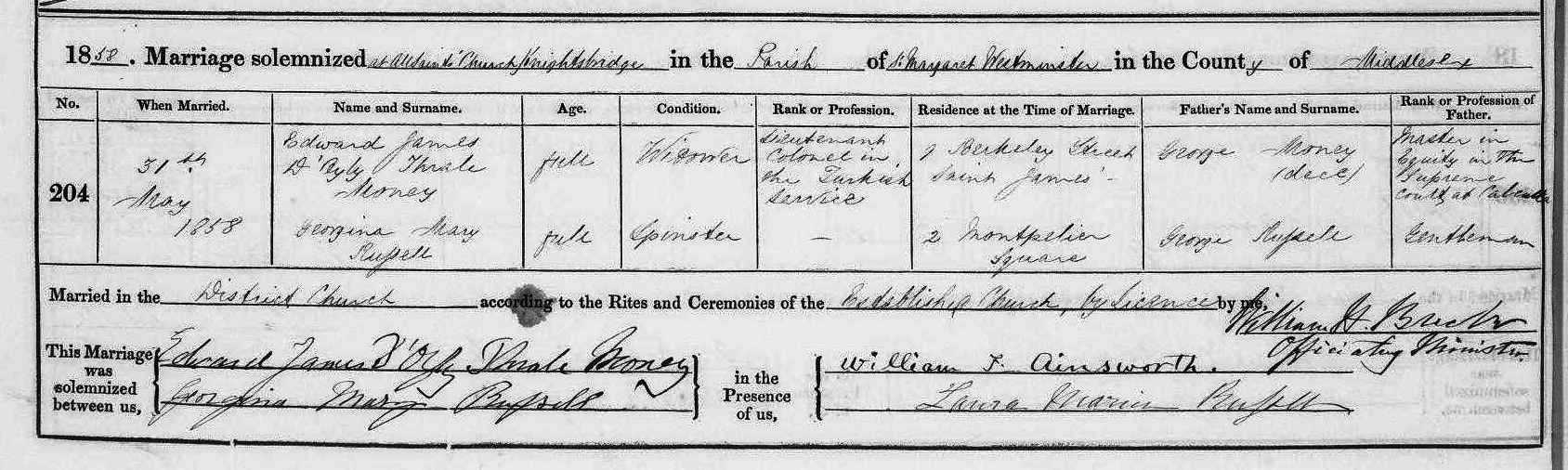 1. Money = Russell marriage: Marriage certificate, 1858, Knightsbridge.