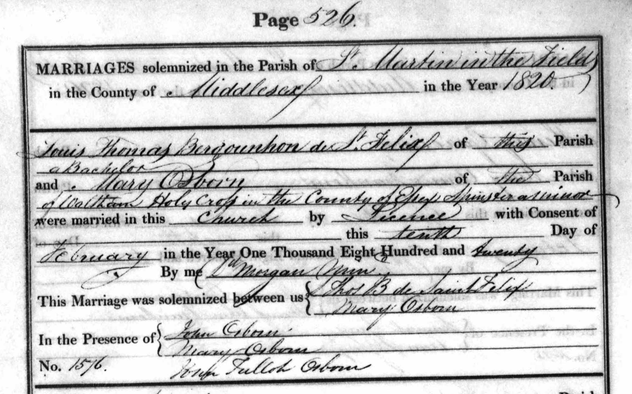 ![]() Mary married Dr Louis Thomas Bergounhon de St. FELIX [1489] [MRIN: 473] on 10 Feb 1820 in St Martins in the Fields Westminster. (Dr Louis Thomas Bergounhon de St. FELIX [1489] was born circa 1785 in Demerara British Guiana and died in 1859 in Savoire France.) |