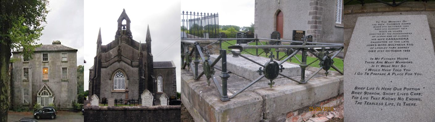 Thomas & Cassandra Hand of Clones: It is my belief that the Rev. Thomas and Cassandra Hand moved into Bishopscourt shortly after the death of the Very Rev Henry Roper in 1847. They called the house 'Altartate Glebe' (Táite na hAltórach). Griffith's Evaluations of the late 1840s lists (14) tenants at Altartate Glebe including the Rev. Thomas Hand. The Rev. Thomas Hand was Rector of Bulphan in Essex before moving to Ireland. His wife was Cassandra More-Molyneux. The presence of the Molyneux name may indicate a link to the Maddens of Hilton Park outside Clones who were closely related to the Molyneux family in the 17th and early 18th century. The Rev. Thomas Hand succeeded the Very Rev Henry Roper as Church of Ireland Rector of Clones in 1847. Ref Bishopscourt, Co. Monaghan: http://www.turtlebunbury.com/history/history_houses/hist_hse_bishopscourt.html