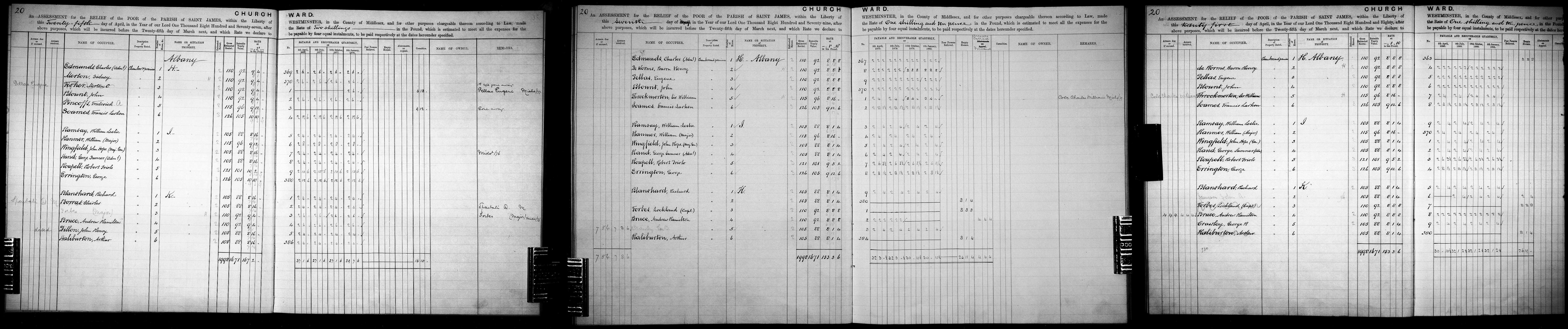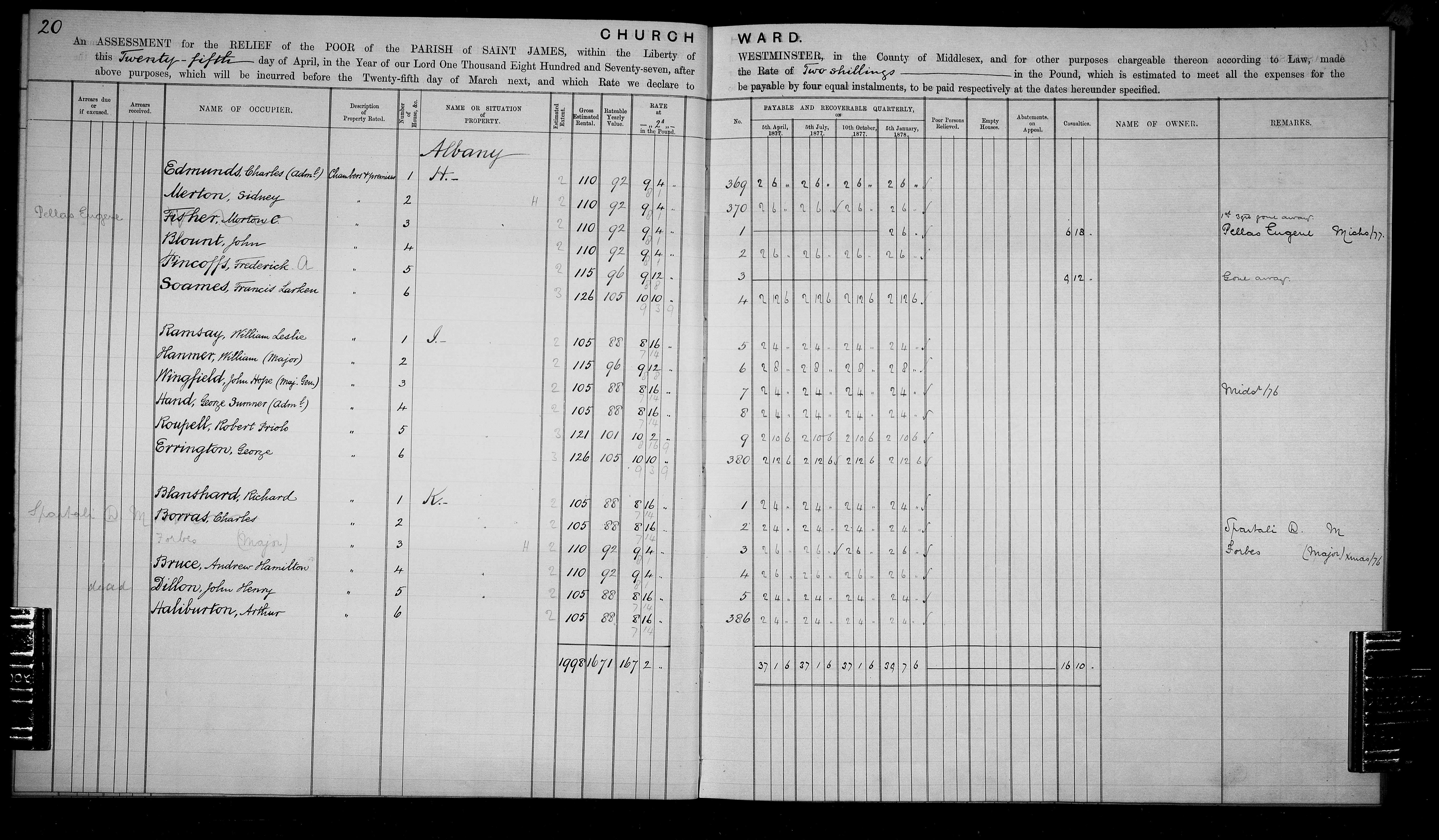 1. George Sumner Hand: Rates paid, 1877- 79 - 1880. St James Westminster Ward. 25 April 1877 Rate for Relief of the poor. Hand George Sumner (Adml), Chambers & Premises, No 4, Est Rental value £105, Rateable yearly value £88, Rate at 2/- per £ - £8 16s 0d payable quarterly at £2 4s 0d