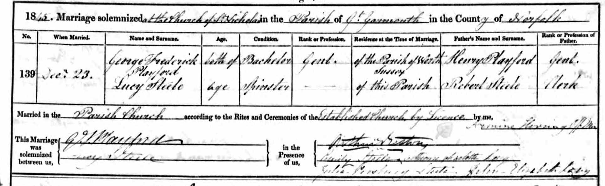 George Frederick Playford Marital Status: Single Marriage Date: 23 Dec 1845 Marriage Place: Yarmouth St Nicholas, Norfolk, England Father: Henry Playford Spouse: Lucy Steele FHL Film Number: 1526456