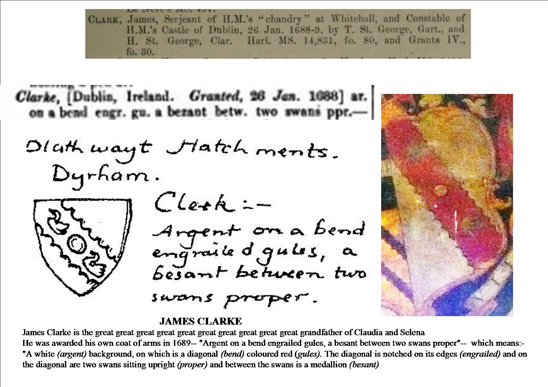 Surrey Coats of Arms. Clarke of West Molesey 1648 - 1709. Extinct 1709. Arms. Argent on a bend engrailed Gules a besant between two swans of the first. Crest. A swan Argent reposing his dexter foot upon a pellet. Granted in 1688 to James Clarke, Controller of the Household to James Butler, Duke of Ormond, Lord Lieutenant of Ireland (Brayley, ii 311)