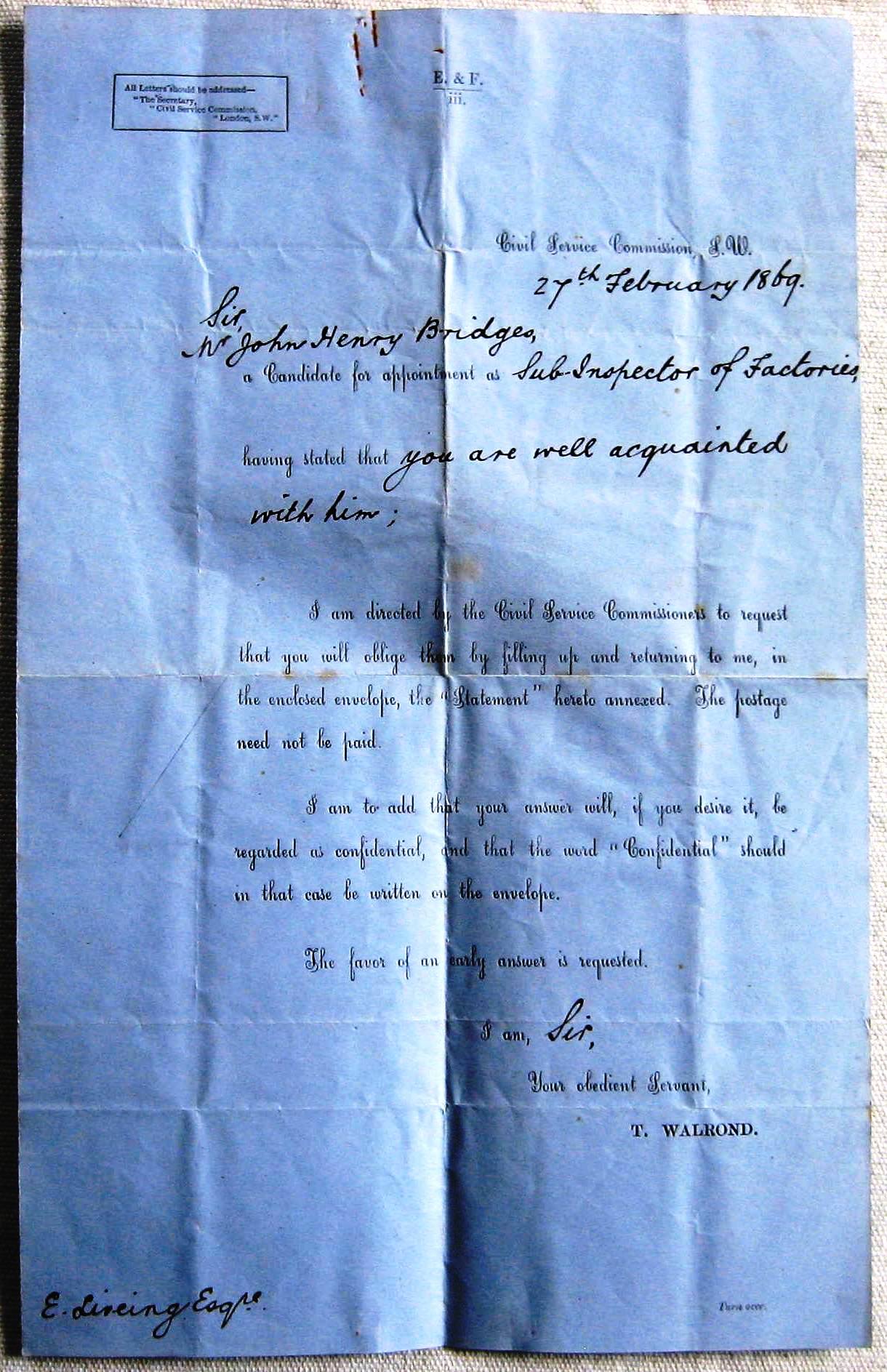 3. John Bridges: John for 20 years was medical inspector to the Local Government Board, 27 Feb 1869. Letter to Edward Liveing Jnr part of the application process for John to work for the Local Govt Board