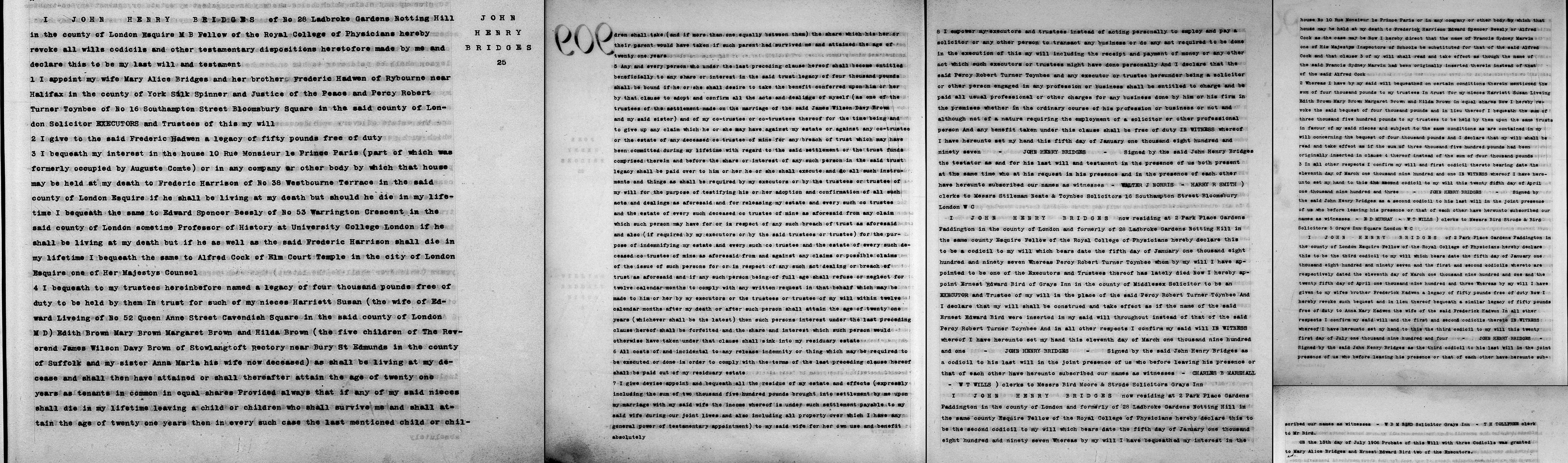 I JOHN HENRY BRIDGES now residing at 2 Park Place Gardens Paddington in the county of London and formerly of 28 Ladbroke Gardens Notting Hill in the same county Esquire Fellow of the Royal College of Physicians hereby declare this to be the second codicil to my will which bears date the fifth day of Jandary one thousand eight hundred and ninety seven Whereas by my will I have bequeathed my interest in the house No 10 Rue Monsieur le Prince Paris or in any company or other body which that house may be held at my death to Frederick Harrison Edward Spencer Beesly or Alfred Cock as the case may be now I hereby direct that the name of Francis Sydney Marvin one of His Majesty Inspectors of Schools be substituted for that of the said Alfred Cock and that clause 3 of my will shall read and take effect as though the name of the said Francis Sydney Marvin had been originally inserted therein instead of that of the said Alfred Cook 2. Whereas I have by my said will bequeathed on certain conditions therein mentioned the sum of four thousand pounds to my trustees in trust for my nieces Harriett Susan Liveing Edith Brown Mary Brown Margaret Brown and Hilda Brown in equal shares Now I hereby revoke the said bequest of four thousand pounds and in lieu thereof I bequeath the sum of three thousand five hundred pounds to my trustees to be held by them upon the same trusts in favour of my said nieces and subject to the same conditions as are contained in my will concerning the bequest of four thousand pounds And I declare that my will shall be read and take effect as if the sum of three thousand five hundred pounds had been originally inserted in clause 4 thereof instead of the sum of four thousand pounds 3. In all other respects I confirm my will and first codicil thereto bearing date the eleventh day of March one thousand nine hundred and one IN WITNESS whereof I have here unto set my hand to this the second codicil to my will this twenty fifth day of April one thousand nine hundred and three JOHN HENRY BRIDGES Signed by the said John Henry Bridges as a second codicil to his last will in the joint presence of us who before leaving his presence or that of each other have hereunto-subscribed our names as witnesses E D MURRAY W T WILLS Clerks to Messrs Bird Strode & Bird. Solicitors 5 Grays Inn Square London W C