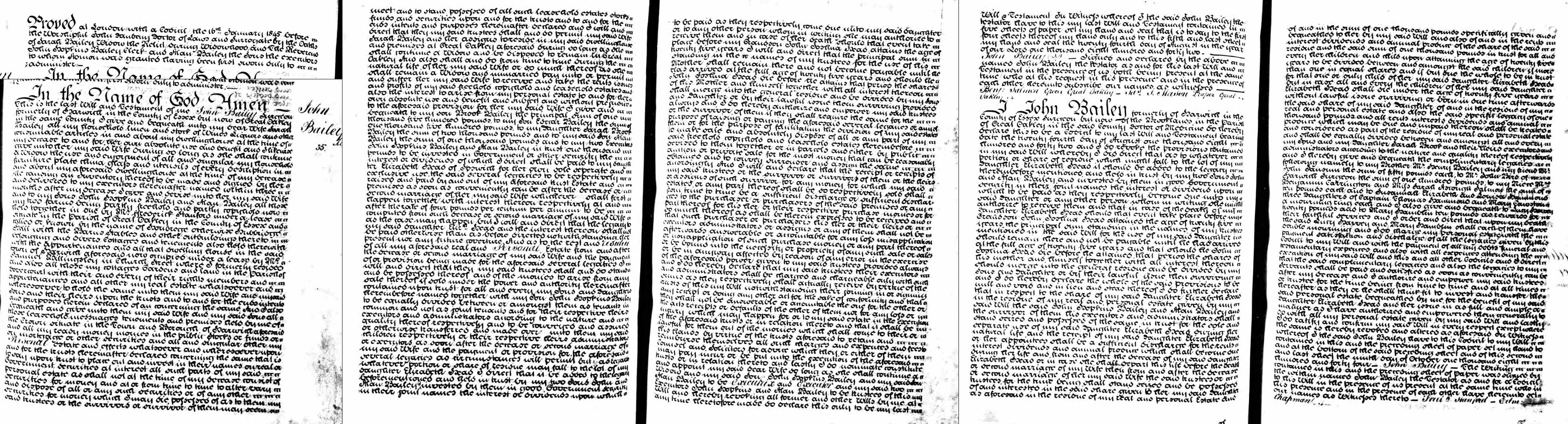 1. Dr John Bailey: Will, 24 Aug 1842. Mentions: (Incomplete) His wife Sarah and executor and trustee His sons John Hopkins Bailey and Alan Bailey and executors and trustees Property in Great Oakley and Harwich. His son Brooke Bailey. His daughter Sarah Brooke Bailey. His son Edgar Bailey. His daughter Elizabeth Head of Ipswich. Grandson John Joshua Head. Brother Henry Bailey. Friend John Sansum. Susanna Elizabeth and Louisa Sansum. Three daughters of Capt Thomas Hammond. Various other persons