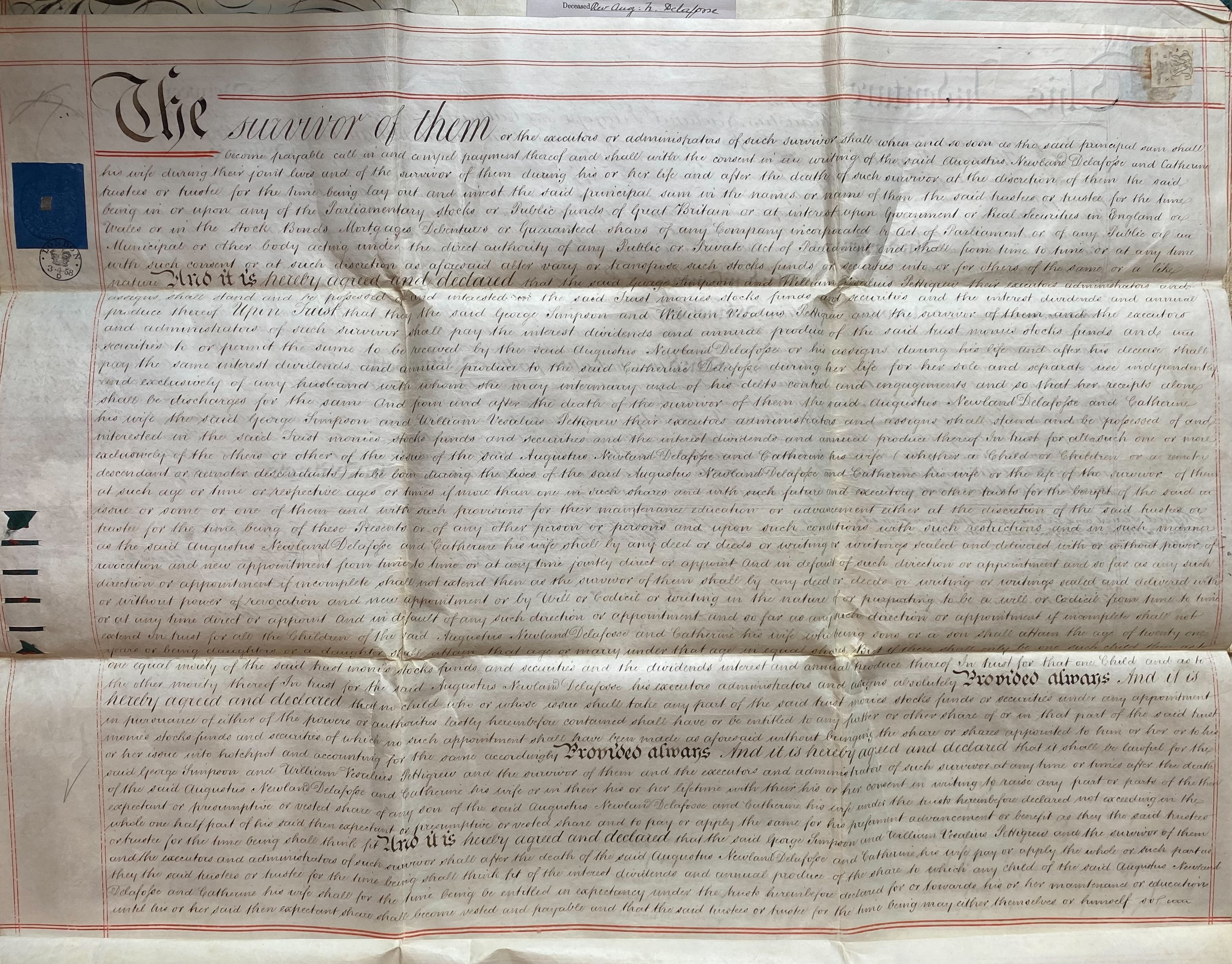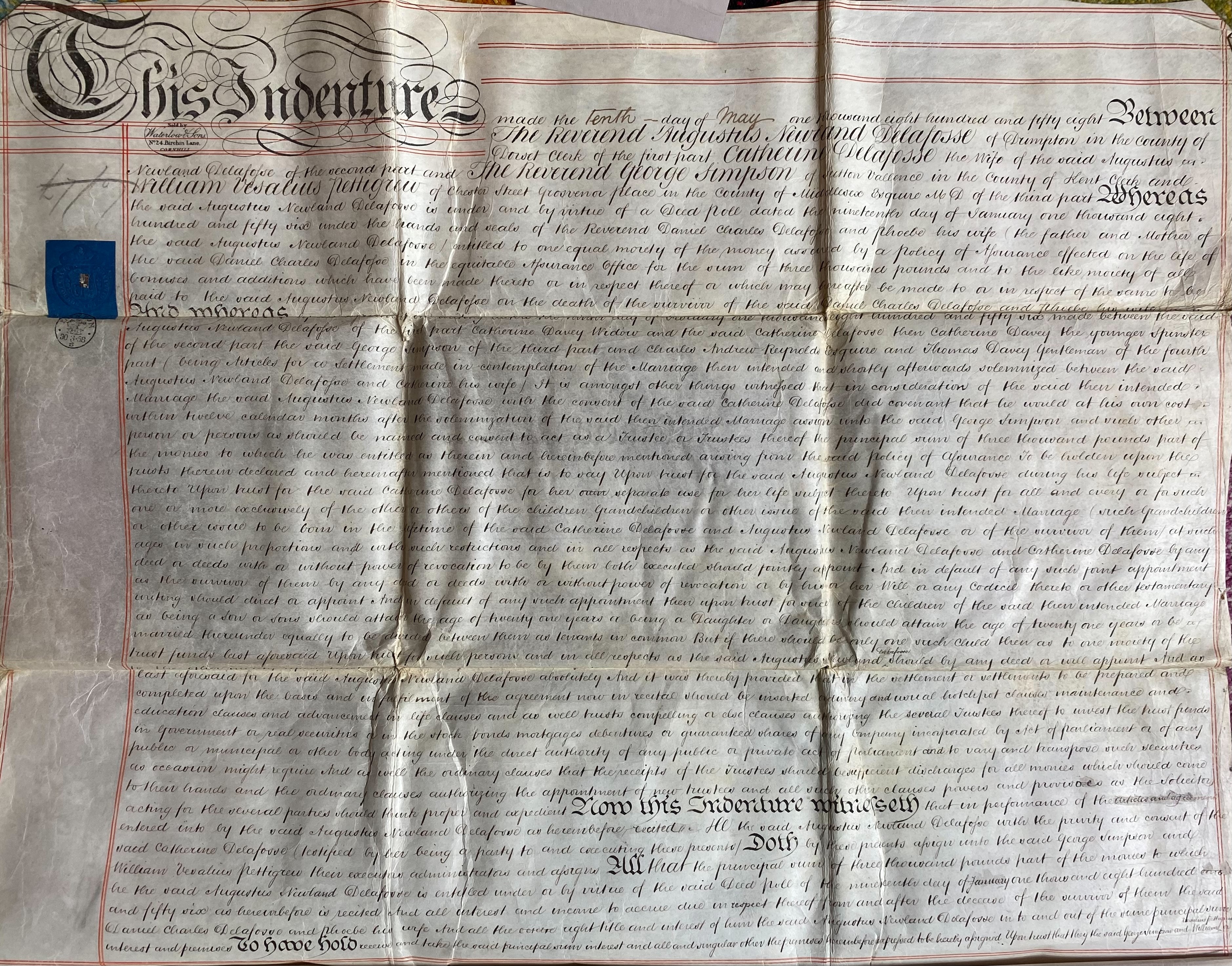 1. Census: England, 30 Mar 1851, Shere SRY. Augustus is recorded as a son unmarried aged 26 the incumbent of St Matthias born Richmond Surrey. ![]() 2. Augustus & Catherine Delafosse. ![]() 3. Augustus & Catherine Delafosse: Discharge of Trusteeship Pettigrew. ![]() 4. Augustus & Catherine Delafosse: Trustee matters. ![]() Augustus married Catherine DAVEY [36014] [MRIN: 13068] in 1856 in Redruth CON. (Catherine DAVEY [36014] was born on 19 May 1826 in Redruth CON and died in May 1869 in Suffolk.) |