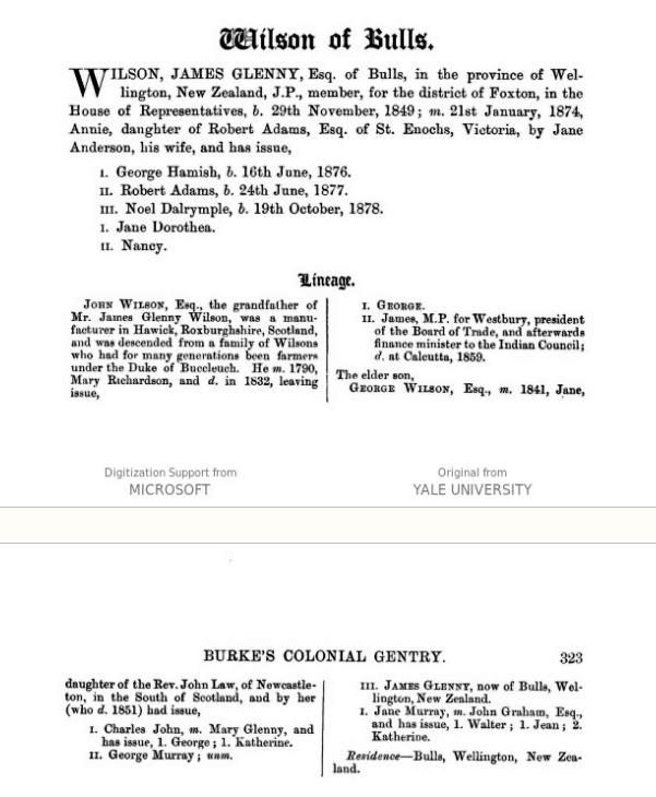 3. George Wilson. In 1891 Burke's published an edition "Burke's Colonial Gentry" in it was a pedigree "Wilson of Bulls" putting James & George Wilson as sons of John and Mary (Richardson). This researcher after considering other evidence to the contrary does not accept this view.