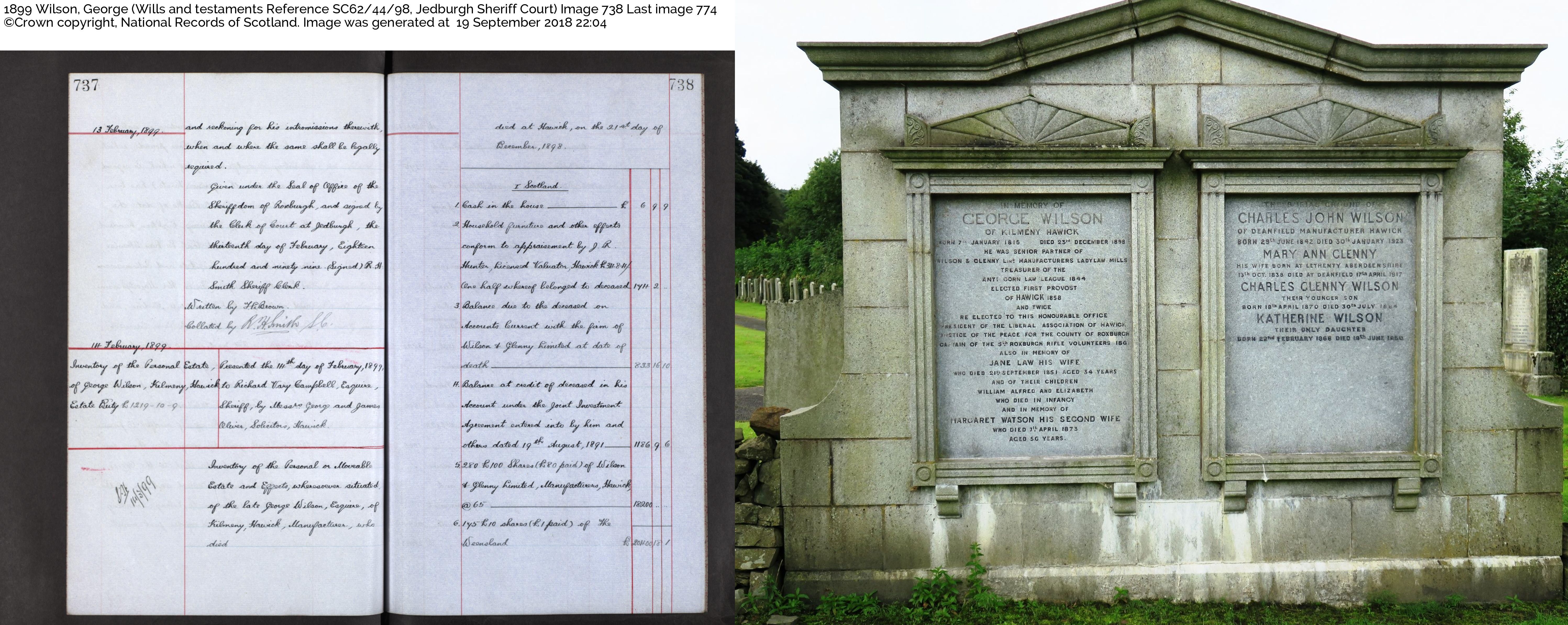 Wilson George, manufacturer, of Kilmeny Hawick died 21 December 1898 at Hawick, testate. Confirmation granted at Jedburgh, 14 February, to Charles John Wilson and George Murry Wilson, manufacturers, Hawick, his sons, Jane Murry Wilson or Graham, wife of John Graham, Huntingstile, Grasmere, his daughter, the said John Graham, his son-in-law, and James Glenny, manufacturer, Hawick, his nephew, Executors nominated in Will or Deed, dated 12 October 1897, and codicil, dated 30 September 1898, and recorded with another Writ in Court Books of Commissariat of Roxburgh, 14 February 1899 Value of Estate £28,463 8s 1d Scottish National Probate Index
