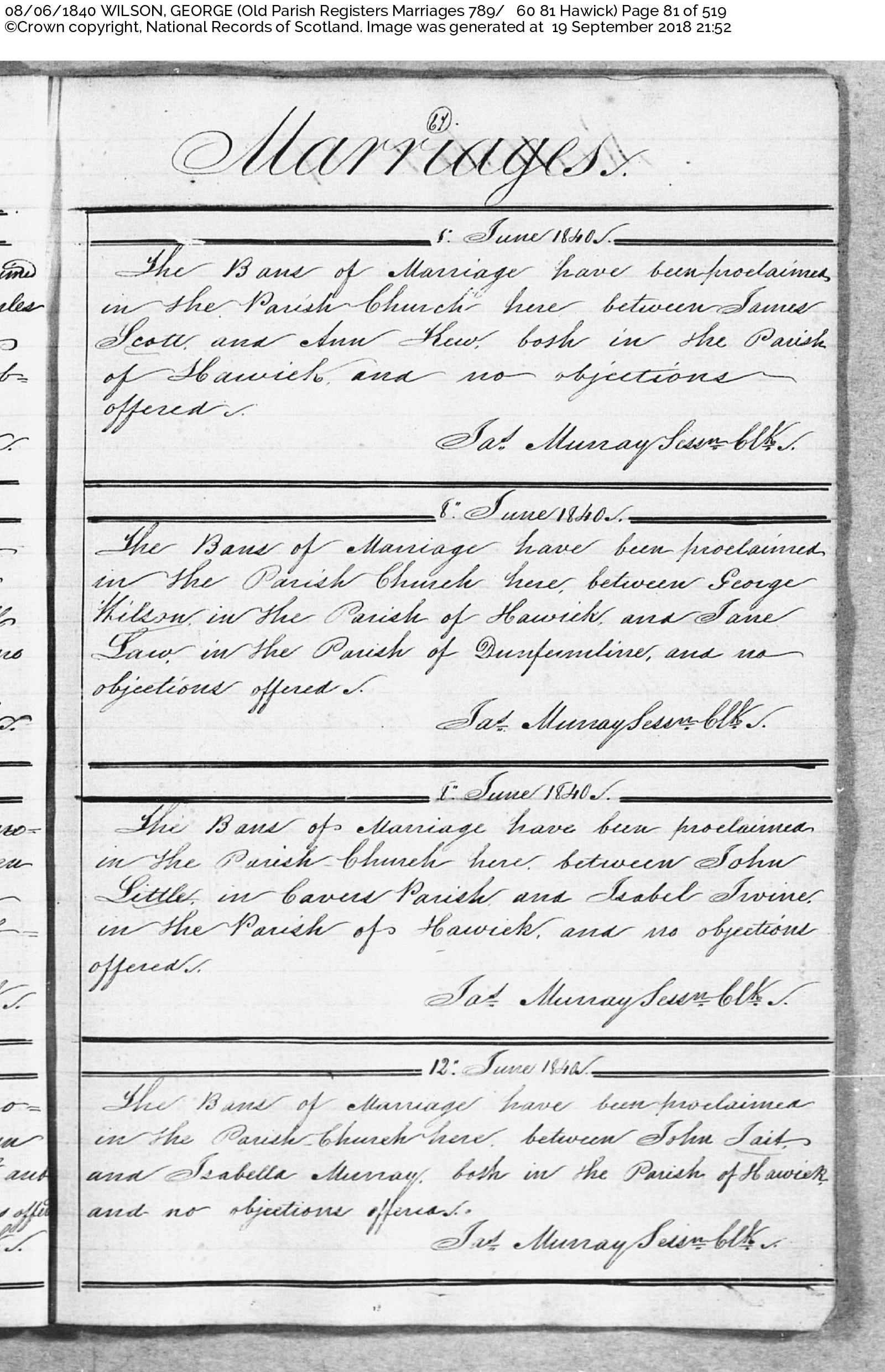 1. Census: Scotland, 1841, Hawick Roxburghshire SCT. Jane is recorded as aged 23 born Roxburghshire. A Jane Law was in the house aged 47 born Roxburghshire Jane married George WILSON [19053] [MRIN: 6851], son of William WILSON [19174] and Elizabeth RICHARDSON [19175], on 8 Jun 1840 in Hawick Roxburghshire SCT. (George WILSON [19053] was born on 7 Jan 1815 in Hawick Roxburghshire SCT, baptised in 1815 in Admitted to the Hawick Friends Meeting and died on 21 Dec 1898 in Hawick Roxburghshire SCT.) |