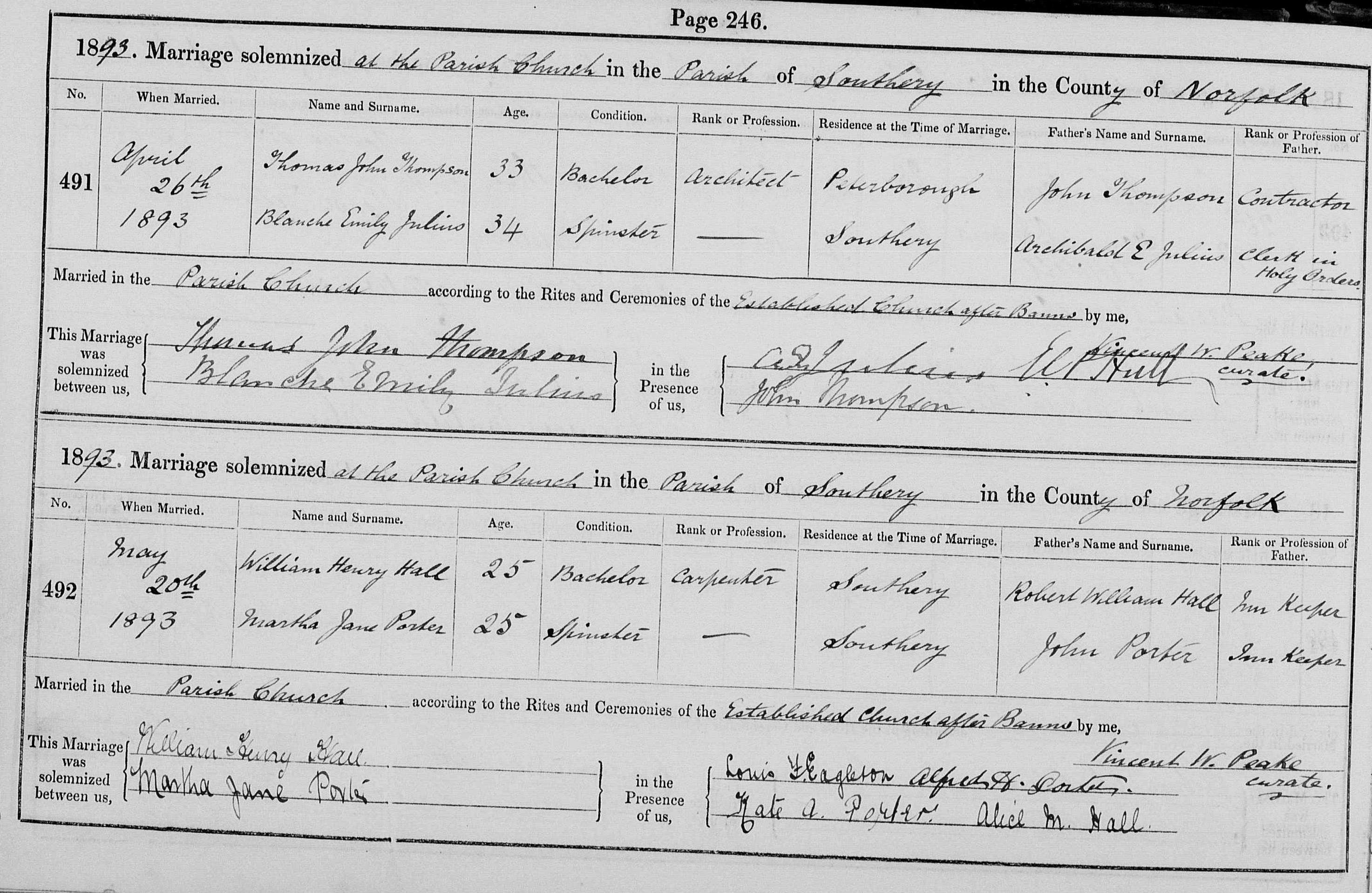 Marriages 26 April 1893. Thomas John Thompson 33 architect of Peterborough father John Thompson contractor to Blanche Emily Julius 34 of Southery father Archibald Eneas Julius Clerk in Holy Orders. Signed by both in the presence of A.E. Julius, John Thompson, E. A. Hull. After Banns, by Vincent W. Peake curate. Ref: marriage register St Mary the Virgin Southery