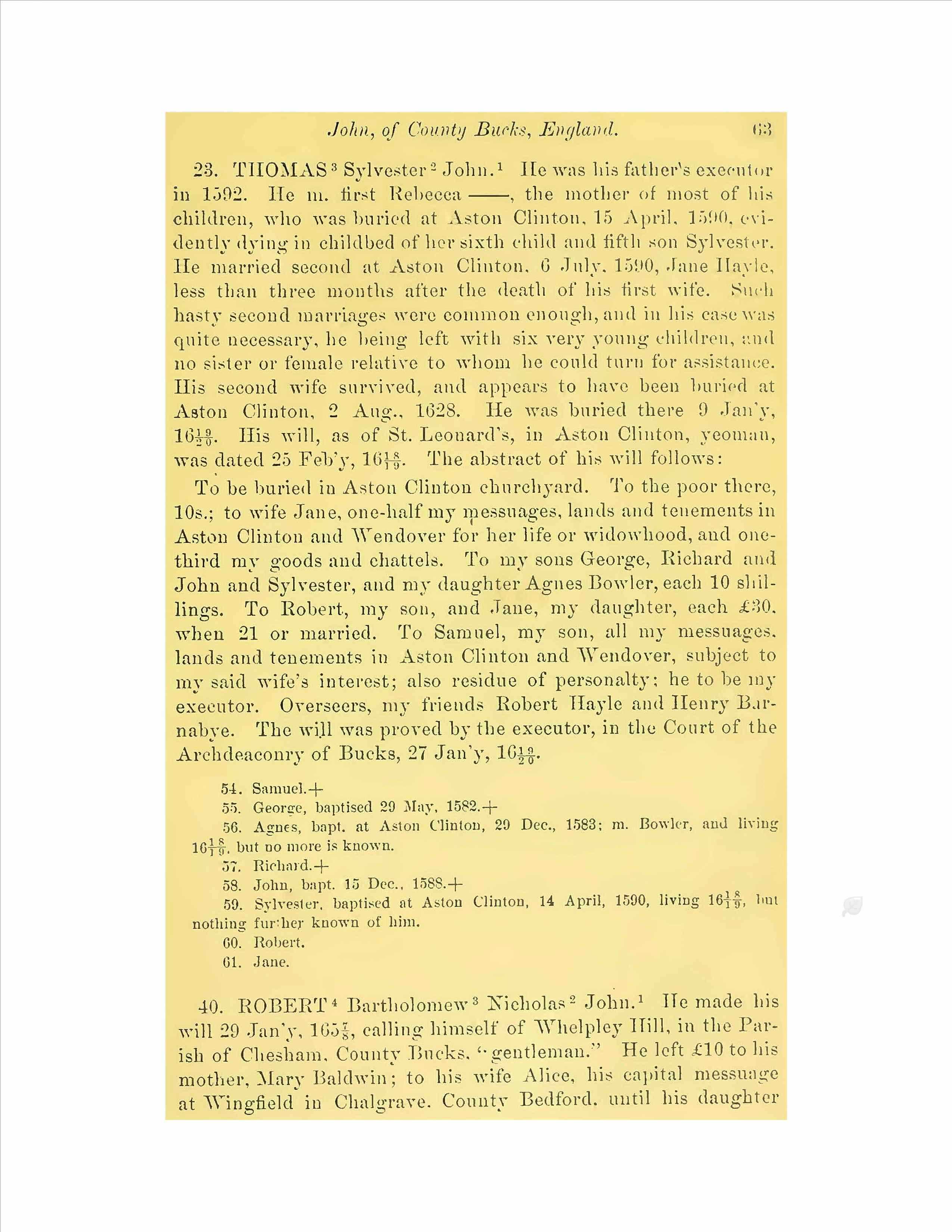 THOMAS BALDWIN. He was his father's executor in 1592. He m. first Rebecca the mother of most of his children, who was buried at ,Aston Clinton, 15 April, 1590. evidently dying in childbed of her sixth child and fifth son Sylvester. He married second at Aston Clinton. 6 July. 1590, Jane Hayle, less than three months after the death of his first wife. Such hasty second marriages were common enough, and in his case was quite necessary, he being left with six very young children, and no sister or female relative to whom he could turn for assistance. His second wife survived, and appears to have been buried at Aston Clinton, 2 Aug 1628. He was buried there 9 Jan, 1619/20. His will, as of St. Leonard's, in Aston Clinton, Yeoman, was dated 25 Feb 1618/19 . The abstract of his will follows: To be buried in Aston Clinton churchyard. To the poor there, 10s. To wife Jane, one-half my Messuages, lands and tenements in Aston Clinton and Wendover for her life or widowhood, and one-third my goods and chattels. To my sons George, Richard and John and Sylvester, and my daughter Agnes Bowler, each 10 shillings. To Robert, my son, and Jane, my daughter, each £30, when 21 or married. To Samuel, my son, all my messuages. lands and tenements in Aston Clinton and Wendover, subject to my said wife's interest; also residue of personalty: he to be my executor. Overseers, my friends Robert llayle and Henry Barnabye. The will was proved by the executor, in the Court of the Archdeaconry of Bucks, 27 Jan,1619/20.