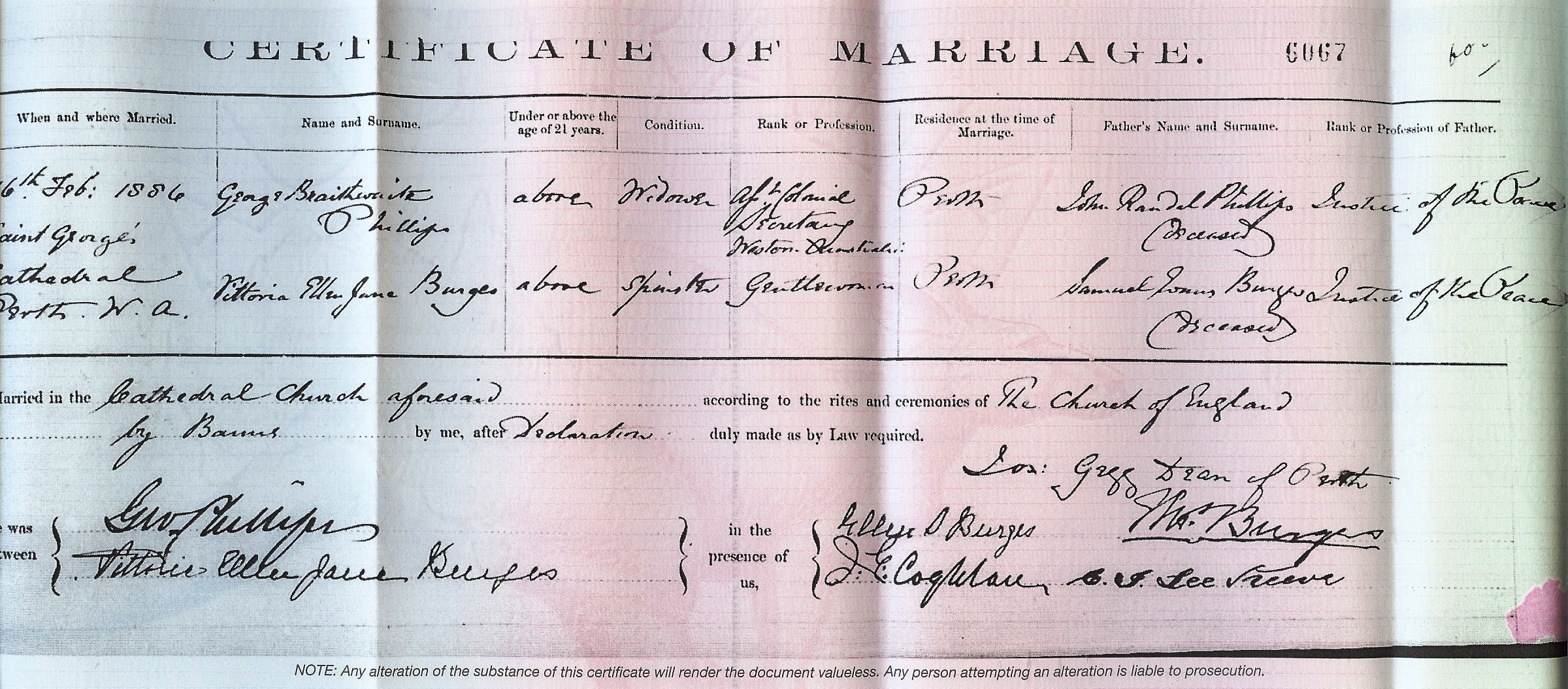 MARRIAGE. PHILLIPS-BURGES February 16 1886, at St. George's Cathedral,- Perth, by the Very Rev. Dean Gegg, GEORGE BRAITHWAITE PHILLIPS, J.P., Assistant Colonial Secretary, to VITTORIA ELLEN JANE, second daughter of the late SAMUEL EVANS BURGES, J.P., of Carleton House, Perth. Ref: The West Australian (Perth, WA : 1879 - 1954) Friday 26 February 1886