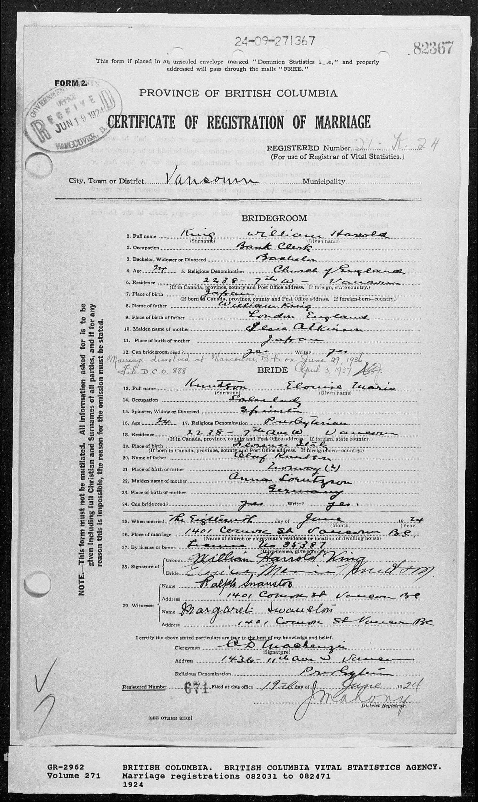 ![]() William married Elouise Marie KNUTSON [24802] [MRIN: 8947] on 18 Jun 1924 in Vancouver CAN. The marriage ended in divorce. |