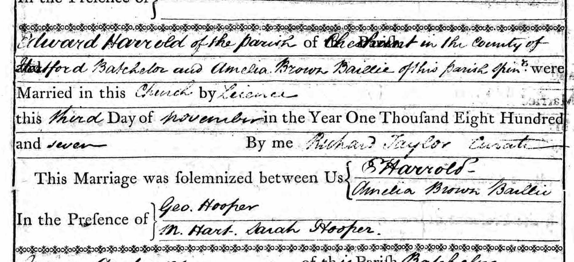 1. Census: England, 30 Mar 1851, Cheshunt Hertford. Amelia is recorded as head of house a widow aged 64 a fundholder born Woodstock OXF. Amelia married Dr Edward Betts HARROLD [133] [MRIN: 9026], son of Thomas HARROLD [131] and Deborah BETTS [21849], on 3 Nov 1807 in St Mary Abbots Kensington London. (Dr Edward Betts HARROLD [133] was born on 4 Aug 1769 and was buried on 25 Sep 1849 in St Mary Cheshunt Hertford.) |