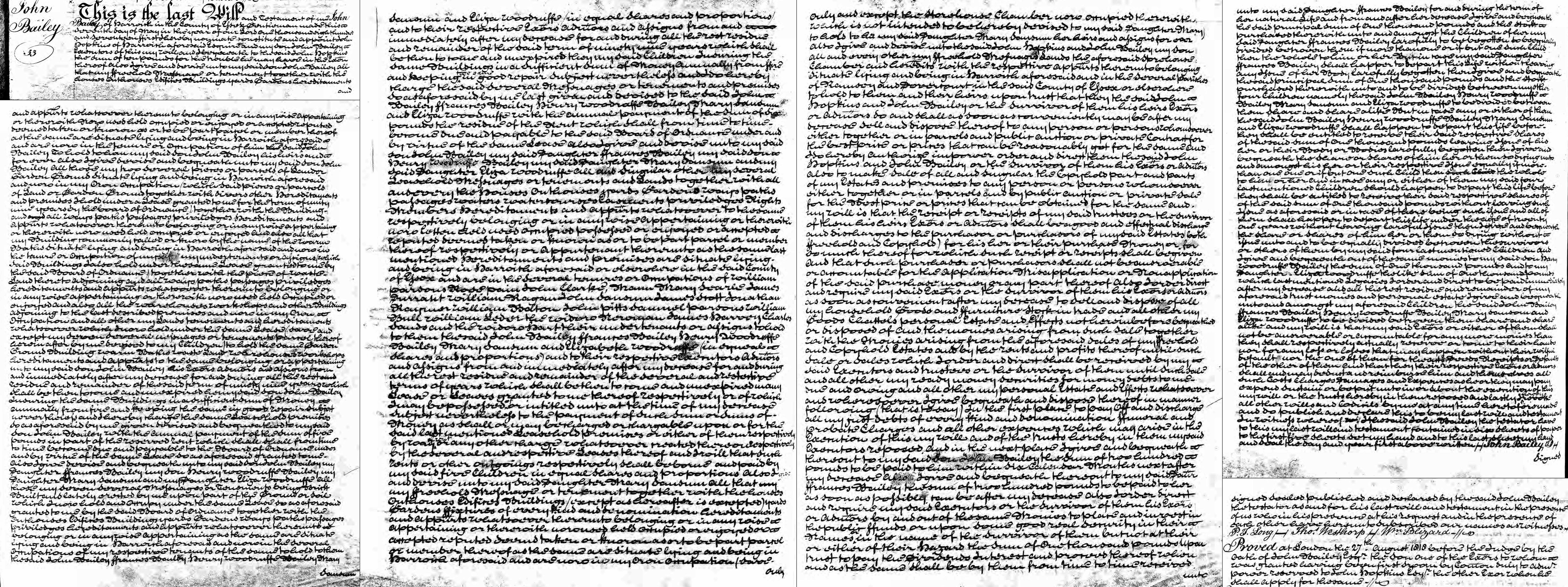 1. John Bailey: Will, 7 May 1817. Extracts: (Incomplete) this is the last will and testament of me John Bailey of Harwich in the County of Essex gentlemen made this 7th day of May in the year of our Lord 1817. Appoints John Hopkins of Harwich Esq and his son John Bailey Executors and Trustees. £10 to John Hopkins for his trouble. To son John Bailey his several freehold properties and properties in Harwich held under a 99 year lease to the Board of Ordnance. To his son John Bailey his daughter Frances Bailey his son Henry Woodruff Bailey his daughter Mary Sansum, his daughter Elizabeth Woodruff my said 5 children seven messuage and tenements brick buildings lately erected by him in Harwich in equal shares, and various other property elsewhere and legacies in cash. To his daughter Mary Sansum a messuage in Harwich in his own occupation. To his daughter Frances Bailey some £200 and the annual proceeds of £1000 invested.