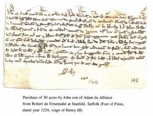 This is the earliest recorded use of the surname in Suffolk, the 1224 Feet of Fines, when John son of Adam de Alliston sold land at Stanfeld. Note a discrepancy, the image says that John son of Adam purchased the land whereas the full transcript from another document records that he sold it ?