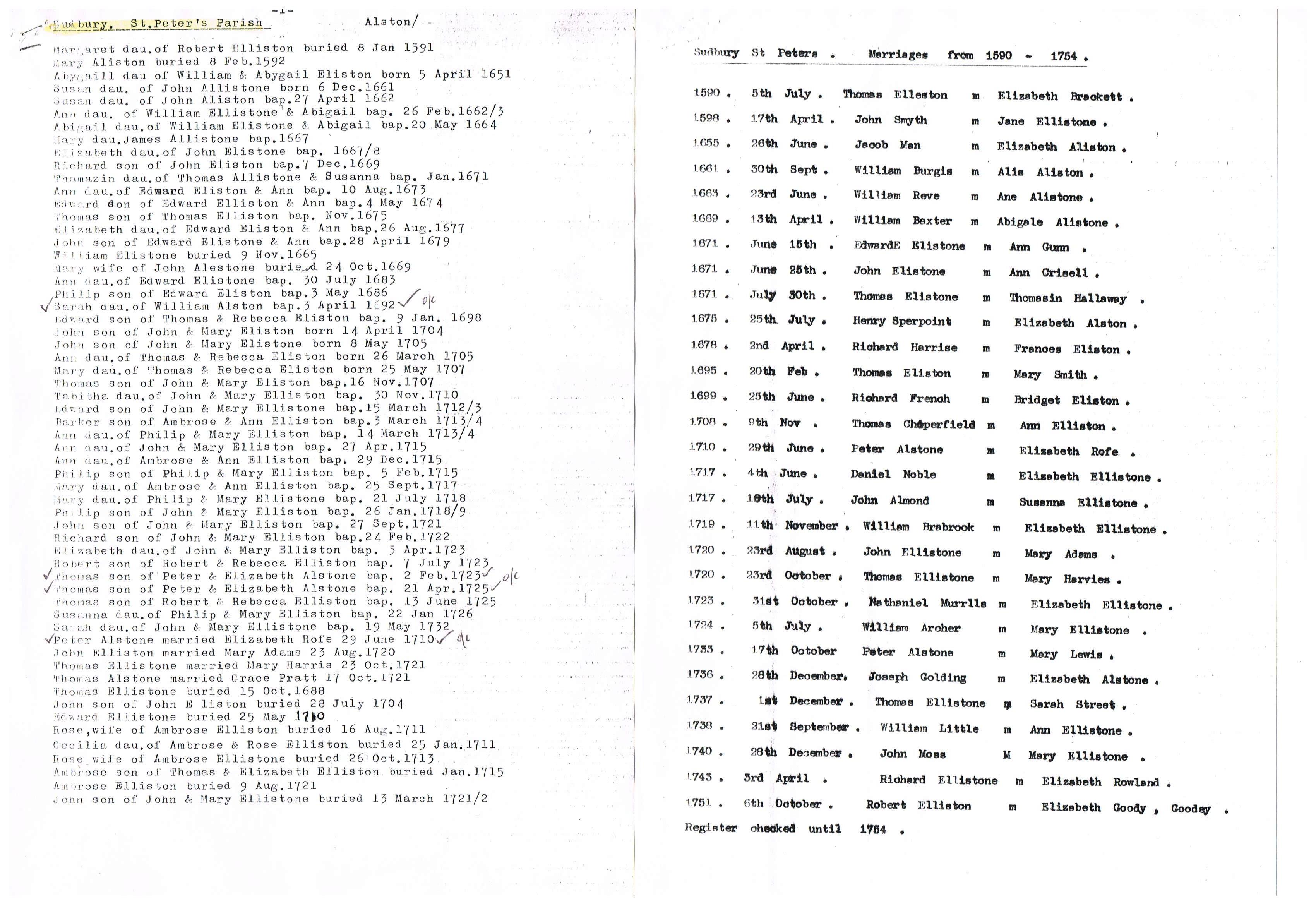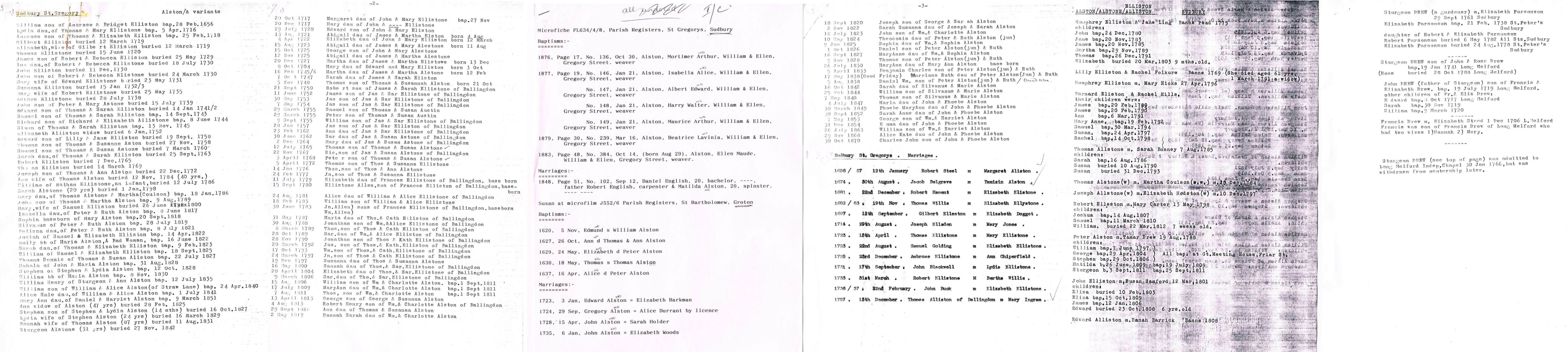 See below for Transcriptions from Parish Registers: Alston St Gregory Sudbury SFK Alston St Peter Sudbury SFK Alston All Saints Sudbury SFK.