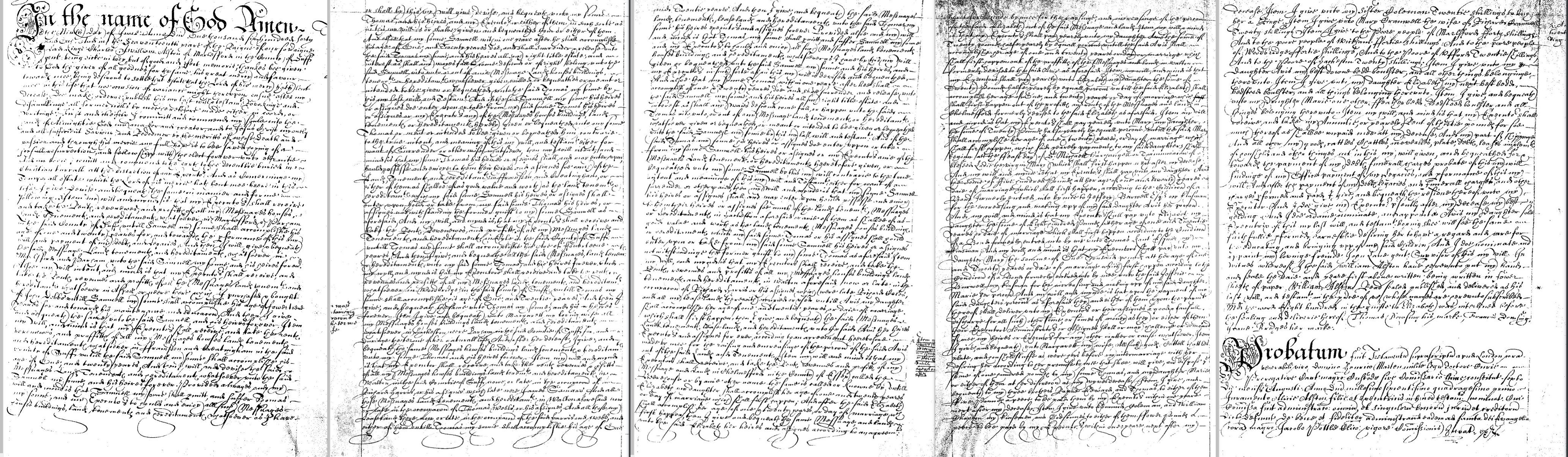 Will of William Alston 1641 " I desire my executors to receive the rents and profits of my mess. tents and heredts in Marlesford and Parham, co. Sufl. until my son Samuel be 21 when said Samuel is to have possession of said property - My lands and ten'ts in Aspall or near thereto I give to my son Samuel at the age of 14, my executors to receive the rents of lands and tenements in Framsden and Creatingham co. Suff. during Samuel's minority The said Samuel not to interfere in any way with the lands left to my son Thomas My executors to hold in trust for my son Thomas until he is 14, my mess. lands, Tenements and heredts in Eyle co. Suff. also until Thomas is 21 my lands and tents in Woodbridge, co. Suff. I give to Margaret my wife my mess. lands &c in Hacheston, near Parham, Suff. with remainder to my son Thomas. Also to my son Thomas my mess lands etc in Walton, Co. Suff said Thomas not to interfere in any with lands left to Samuel I desire my executors to receive the rents of certain lands in Walton in trust for my dau. Avis until she is 21 My executors to hold in trust for my daughter Elizabeth until she is 21, the rents of my Mess. and lands in Chelmsford Co. Essex called the Beerehouse I give to my dau. Avis L20 yearly, until she is 21 - the same to my dau. Elizabeth - to be paid out of the profits of the lands left to them I give to my dau. Mary L20 yearly until she is 21 to my dau Avis L500 on her marriage or age of 21 to my dau. Eliz. L800 to my dau. Mary L1000 I desire that Margaret my wife may have all goods, chattels, cattle, plate and household stuff, which were hers before our marriage, she to give to my son Thomas and dau. Marie L100 at her decease to the poor of Marlesford 40/- to the poor of Wickham 40/-