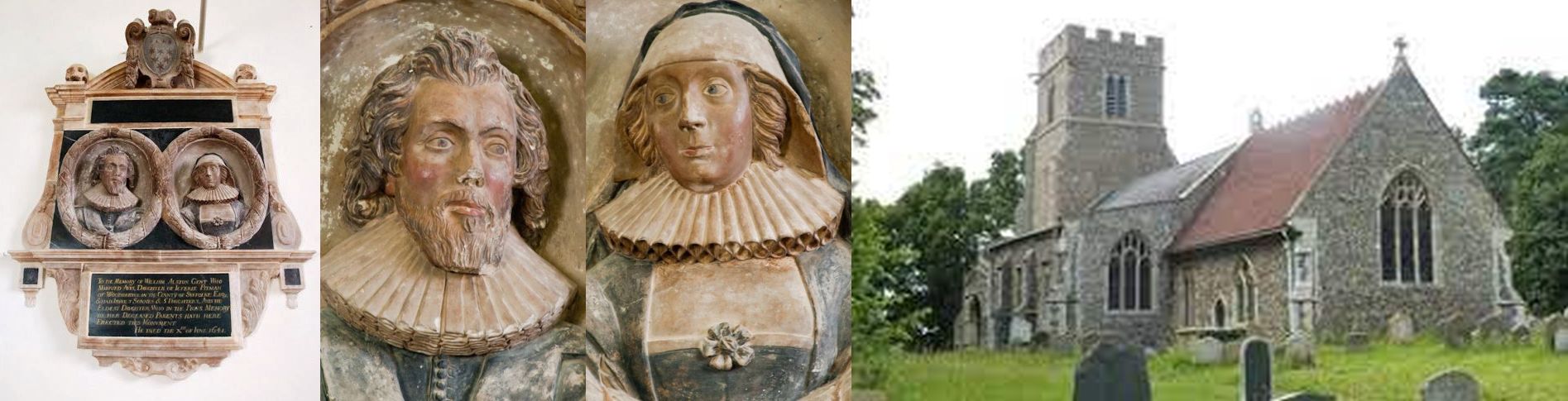 3. William & Avice Alston: Memorial, 1641, St Andrew Marlsford SFK. MARLESFORD.-The wall of ye Chancel. A monument of blk marble and alabaster The busts of a man and his wife-stone-colored wth. ruffs rd. their necks and in an oval frame work of leaves-agst. a semi circular Pediment a shield a skull on each side-on the shield.