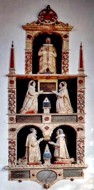 Woodbridge Suffolk " Here lyeth Jeffrey Pitman, Esq. and sometime High Sheriffe of Suffolk, who died ye 21 of May A 1627 ^Etatis 67. He had two wives Alice & Anne. Alice dyed 29 of Aug 1613 Etatis 52 ; By her he had 7 children. 3 died in their infancy, William his eldest Sonne was a long time student in Graves Inn. He died Sep 23 1615 Etatis 24 : Jeffrey his second son was likewise a student in Grayes Inn and died ye 9 of Feb 1626 Etatis 24. Anne his second wife still liveth as also his two daughters Mary and Avise" Geoffrey, a tanner and haberdasher was Sheriff of Suffolk 1625 and a "liberal benefactor" of the parish He m1 Alice d1613 Children 1. William 1615 dsp aged 24 2. John 1626 dsp aged 24 3.. Mary 1647 m Edmund 1652 son of NIcholas Burwell of Rougham by Alice Curteys 4. Avise m William Alston of Marlesford He m2 Anne On the death of Geoffrey in 1627, the estates passed to his grandson Geoffrey Burwell Monument made in painted and gilded marble perhaps by Gerard Janssen www.flickr.com/photos/52219527@N00/517838379/ <http://www.flickr.com/photos/52219527@N00/517838379/>