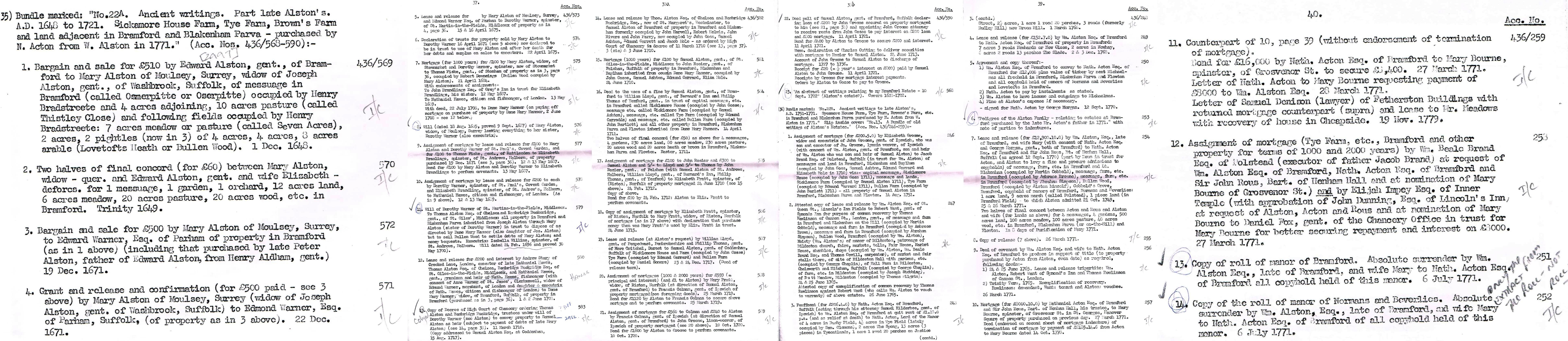 Bundle marked: "No.22B. Ancient writings to late Alston's, A.D. 1751-1771. Sycamore House Farm, Tye Farm, Browne's Farm, etc. in Bramford and Blakenham Parva purchased by N. Acton from W. Alston in 1771. HA61/436/246-259