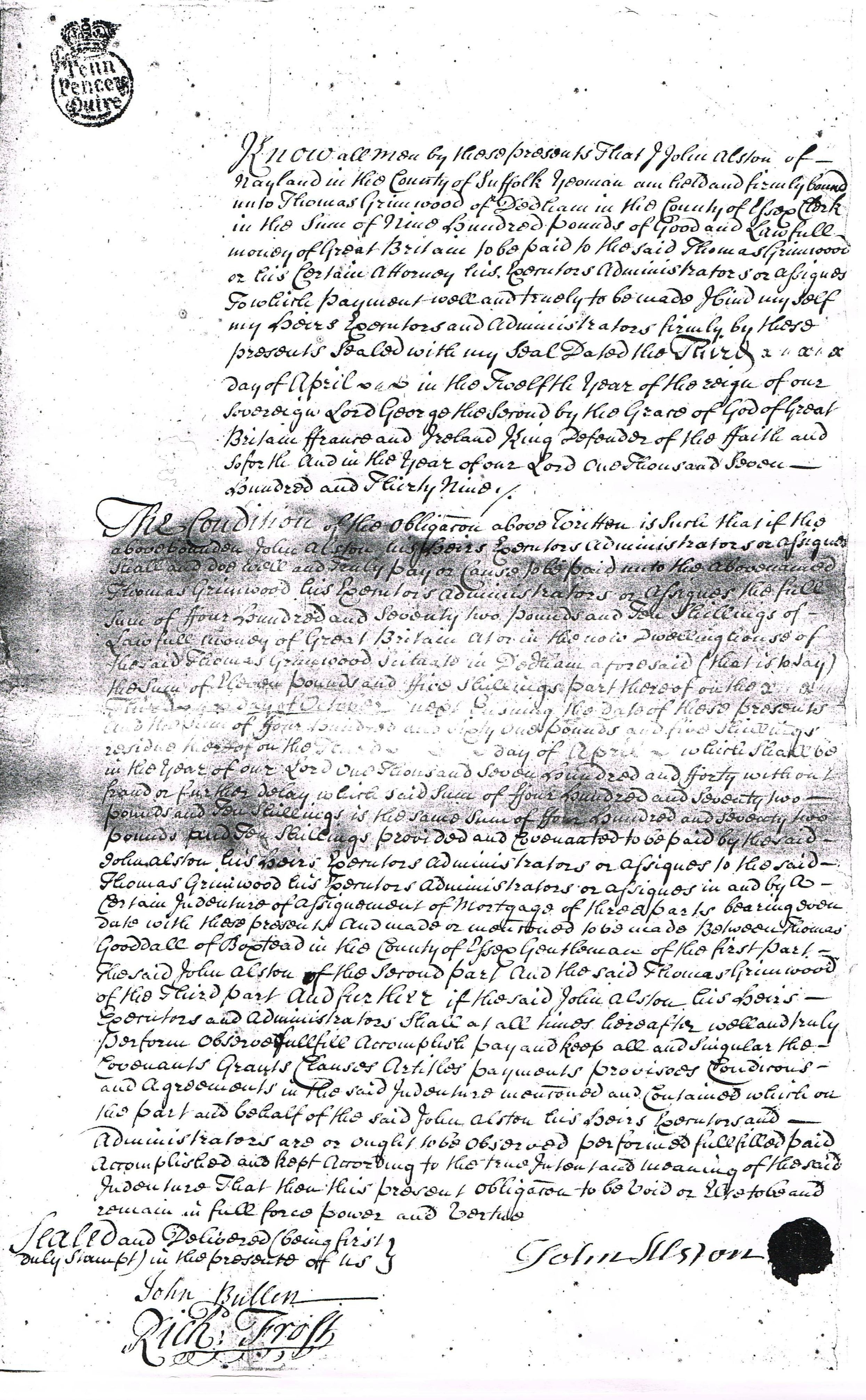 9. John Alston: Bond to Thomas Grimwood, 3 Apr 1739, Nayland. BOND JOHN ALSTON AND THOMAS GRIMWOOD Know all men by these presents that I John Alston of Nayland in the County of Suffolk Yeoman am held and firmly bound unto Thomas Grimwood of Dedham in the County of Essex Clerk in the sum of nine hundred pounds of good and lawful money of Great Britain to be paid to the said Thomas Grimwood or his Certain Attorney his Executors Administrators or Assignes To which payment well and truly to be made I bind myself my heirs Executors and Administrators firmly by these presents sealed by my seal dated the Third day of April in the Twelfth year of the reign of our Sovereign Lord George the Second by the grace of God of Great Britain France and Ireland King Defender of the Faith and soforth. And in the year of our Lord one Thousand Seven Hundred and Thirty Nine. THE CONDITION of the above obligation above written is such that if the above bounden John Alston his Heirs Executors Administrators or Assignes shall and do truly pay or cause to be paid unto the abovementioned Thomas Grimwood his Executors Administrators or Assignes the full sum of four hundred and seventy two pounds and ten shillings of lawful money of Great Britain at or in the note [?] dwelling house of the said Thomas Grimwood situated in Dedham aforesaid (that is to say) the sum of eleven pounds and five shillings part thereof on the 2nd [?] Friday [?] 7 [?] day of October next Ensuing the date of these presents and the sum of four hundred and sixty one pounds and five shillings residue thereof on the third day of April which shall be in the year of our Lord one thousand and forty without fraud? or further delay which said sum of four hundred and seventy two pounds and ten shillings is the same sum of four hundred and seventy two pounds and ten shillings provided and covenenanted to be paid by the said John Alston his Heirs Executors Administrators and Assignes to the said Thomas Grimwood his Executors Administrators and Assignes in and by a certain Indenture of Assignement of Mortgage of three parts bearing even date with these presents and made or were caused to be made between Thomas Goodall of Boxted in the County of Essex Gentleman of the first part the said John Alston of the second part and the said Thomas Grimwood of the third part AND FURTHER if the said John Alston his Heirs Executors Administrators shall at all times hereafter well and truely perform observe and fulfill accomplish pay and keep all and singular the Covenants Grants Clauses Articles Payments Provisions Conditons and Agreements in the said Indenture mentoned and contained which on the part and behalf of the said John Alston his Heirs Executors and Administrators are or ought to be Observed Performed Fulfilled Paid Accomplished and kept According to the true intentioned meaning of the said Indenture That then this present obligation to be void or cease to be and remain in full force power and virtue. Sealed and delivered (being first duly stampt) in the presence of us: John Alston (seal) John Bullen Rich Frost. Ref; Bury St Edmunds Public Records Office 391/70