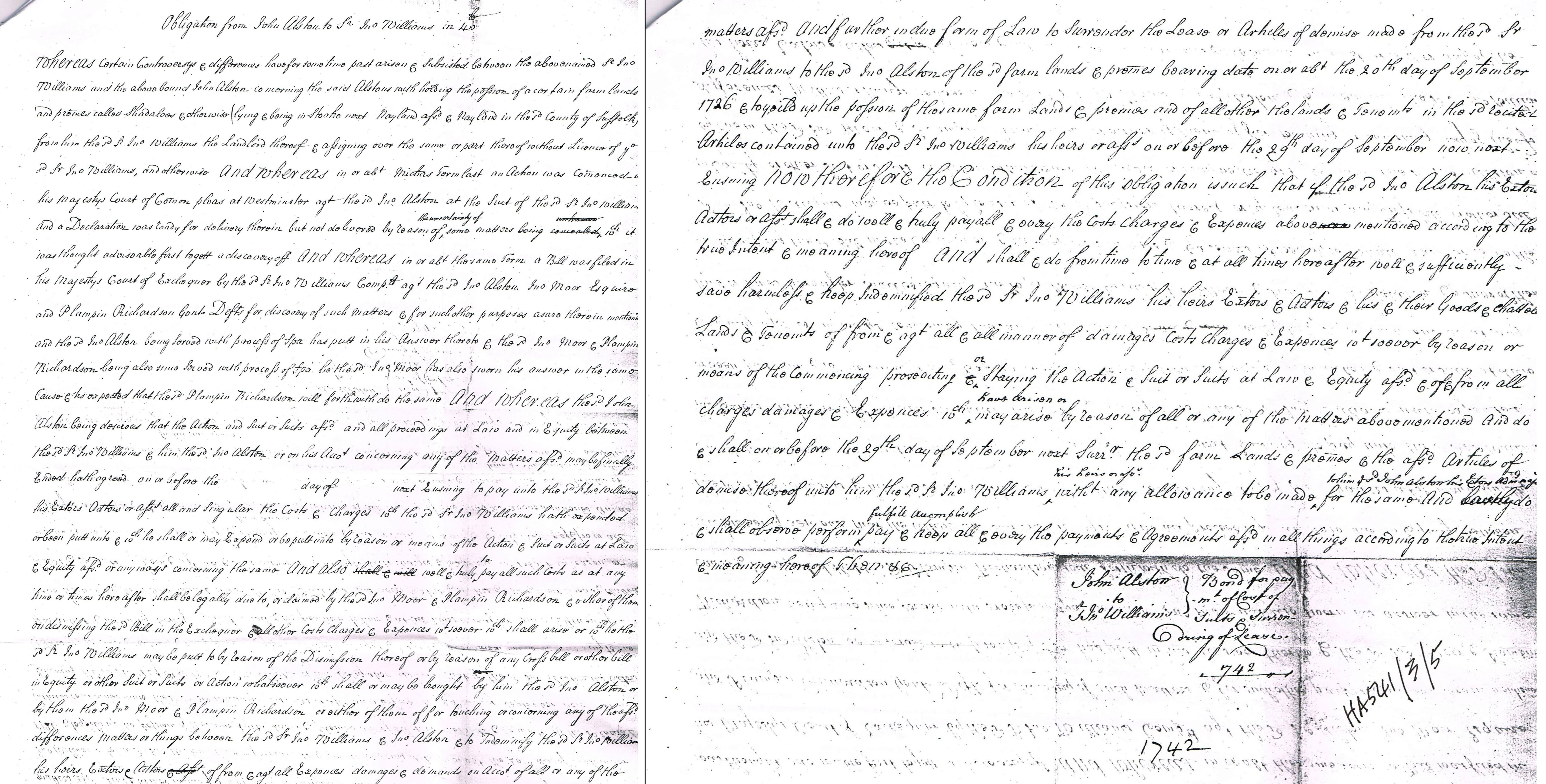 10. Obligation from John Alston to Sr Jno Williams, 1742, Stoke By Nayland SFK. Obligation from John Alston to Sir Jno Williams John Alston agrees with Sir John Williams to pay the cost of a court case and surrender his lease of "Shadloes" farmland in Stoke by Nayland: OBLIGATION - from John Alston to Sir Jno Williams Copy of a bond dated 1742 for payment of cost of suits and surrender of lease dated 20 Sept 1726 of farm lands and premises in Stoke by Nayland. Whereas certain controversys and differences have for some time past arisen & subsided between the above named Sir Jno Williams and the above named John Alston concerning the said Alston withholding the possion of a certain farmlands and premises called Shadalooes & otherwise lying and being in Stoke next Nayland aforesaid & Nayland in the co of Suffolk from him the said Sir Jno Williams the landlord thereof and assisning over the same or part thereof without licence of said Sir Jno Williams and otherwise. AND WHEREAS in or about Michas Term last an Action was comenced in His Majestys Court of Common pleas at Westminster against the said Jno Alston at the suit of the said Sir Jno Williams and a declaration was ready for delivery therein but not delivered by reason of the uncertainty of some matters ("being concealed" and "unknown" is written, then struck out) which it was thought advisable first to get a discovery off. AND WHEREAS in or about the same time term a Bill was filed in His Majestys Court of Exchequor by the said Sir Jno Williams Compt against the said John Alston, John Moor Esq, and Plamplin Richardson Gent. Defts for the discovery of such matters and for such other purposes as are therein mentioned and the said John Alston being served with process of spa has put in his answer thereto & the said Jno Moor & Plamplin Richardson being also since served with process of spa the said Jno Moor has also sworn his answer in the same cause and it is expected that the said Plamplin Richardson will forthwith do the same. AND WHEREAS the said John Alston being desirous that the Action and the Suit or Suits aforesaid and all proceedings at law and in equity between the said Sir Jno Williams & him the said Jno Alston or on his account concerning any of the matters aforesaid may be finally ended hath agreed on or before the . . . . . (Date not entered on MS) . . . . . day of . . . . . next ensuing to pay unto the said Sir Jno Williams his Executors Administrators and Assigns all and singular the costs and charges which the said Sir Jno Williams hath expended or been put unto and which he shall expend or be put unto by reason or means of the Action or Suit or Suits at Law & Equity aforesaid or any ways concerning the same. AND ALSO well and truly to pay all such costs as at any time or times hereafter shall be legally due to or claimed by the said Jno Moor & Plamplin Richardson & either of them on dismissing the said Bill in the Exchequor & all other cost charges & expenses whatsoever which shall arise which he the said Sir Jno Williams may be put to by reason of the dismission thereof or by reason of any Cross Bill or any other Bill in Equity or Suit or Suits or Action whatsoever which shall or may be brought by him the said Jno Alston or by them the said Jno Moor & Plamplin Richardson or other of them of for touching or concerning any of the aforesaid differences matters or thing between the said Sir Jno Williams & Jno Alston & to indemnify the said Sir Jno Williams his Heirs Executors Administrators of from & against all expenses damages and demands on account of all or any of the matters aforesaid AND FURTHER in due form of law to surrender the Lease or Articles of Demise made from the said Sir Jno Williams to the said Jno Alston of the said farm lands and premises bearing date on or about the 20th day of Sept 1726 and to yield up the possession of the same farm lands and premises and of all other the lands and tenements in the said recited Articles contained unto the said Sir Jno Williams his Heirs or Assigns on or before the 29th Sept now next ensuing NOW THEREFORE THE CONDITION of this obligation is such that if the said Jno Alston his Exs etc shall and do well and truly pay all and every the costs charges and expenses above mentioned according to the true intent and meaning hereof AND shall and do from time to time and at all times hereafter well and sufficiently save harmless and keep indemnified the said Sir Jno Williams his Heirs etc and his and their goods and chattles lands and tenements of from and against all and all manner of damages costs charges and expenses whatsoever by reason or means of the commencing prosecuting and or staying the action and Suit or Suits at Law and Equity aforesaid and of and from all charges damages and expenses which have arisen or may arise by reason of any of the matters abovementioned and do and shall on or before the 29th day of Sept next surrender the said farm lands and premises and the aforesaid Articles of Demise thereof unto him the said Sir Jno Williams his Heirs etc without any allowance to be made to him the said Jno Alston his Exc's etc for the same AND shall observe perform fulfill accomplish and keep all and every the payments and agreements aforesaid in all things according to the true intent and meaning hereof Ref: Bury St Edmonds Public Records Office HA541/3/5 Does this action suggest that John Alston was a somewhat difficult man to deal with ?