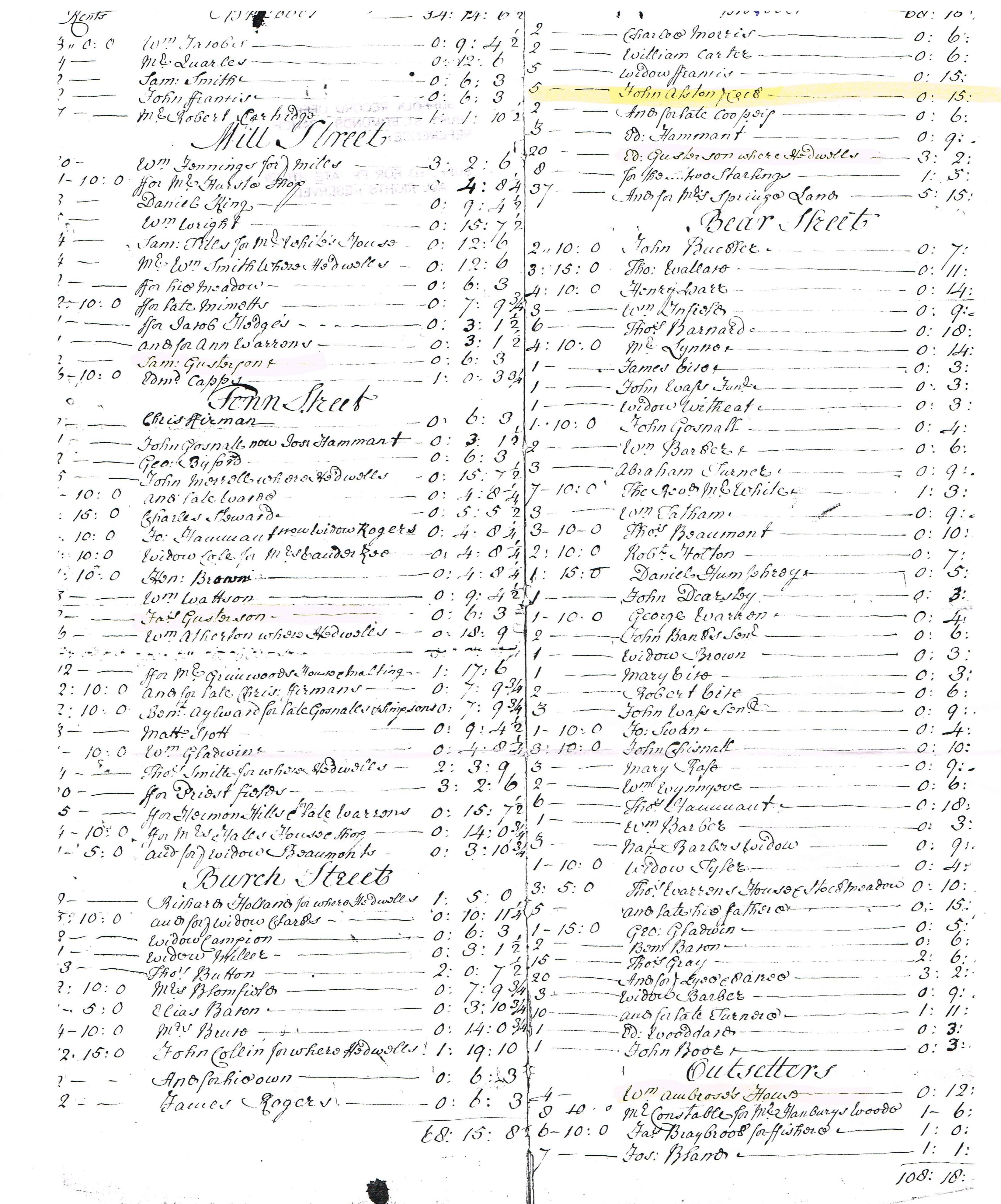 12. Tithe Payers (part) Nayland Village, 20 May 1750. Note John Alston at The Cock Burch St. Also other family members in the village. Bury RO HA541/2/5/3