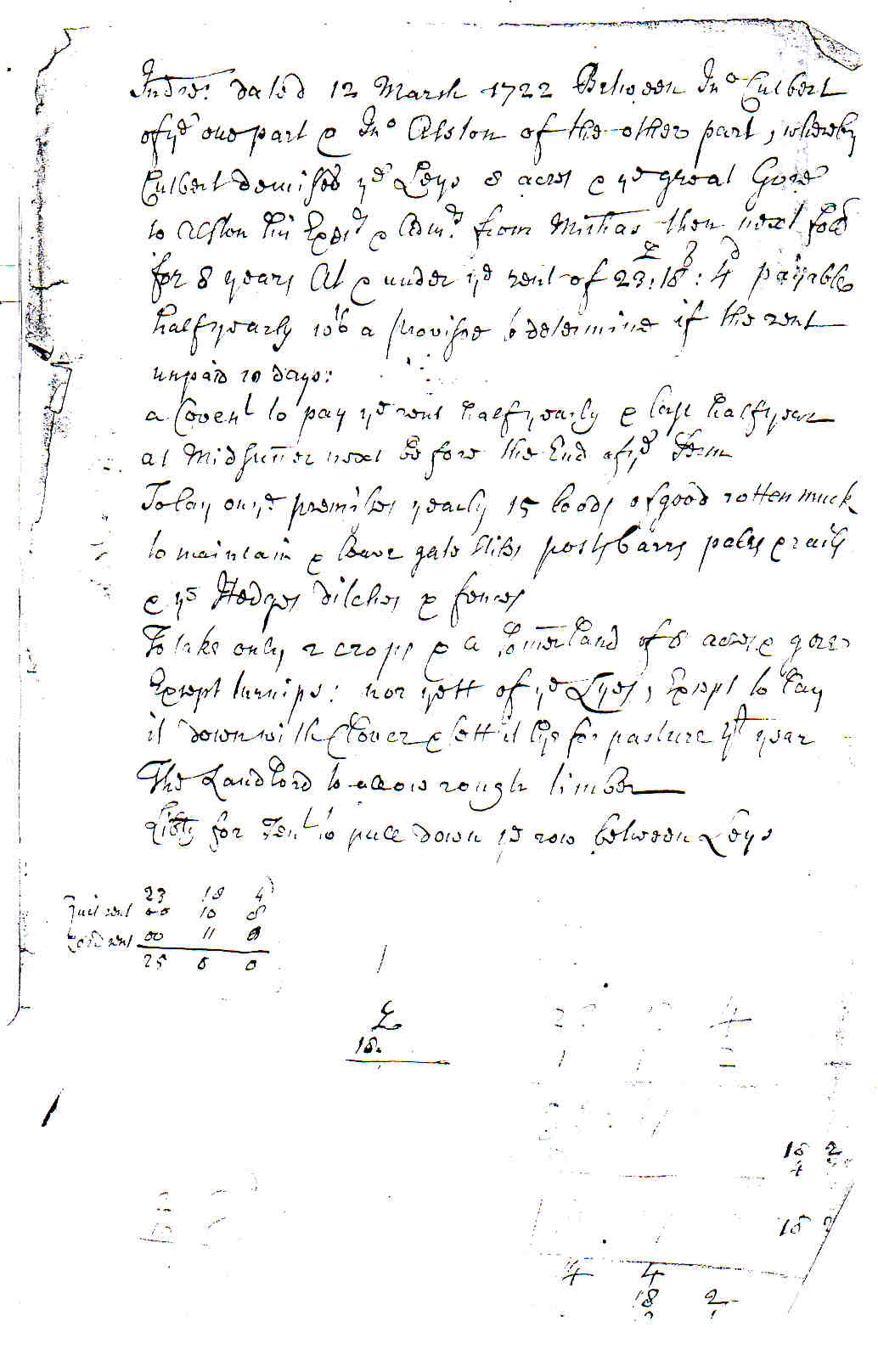 2. John Alston: Indenture with John Culbert, 12 Mar 1721/22. Indenture dated 12 Mar 1722 Between Jno Culbert of ye one part and Jno Alston of the other part, whereby Culbert demised ye Leys 8 acres & ye great Gow to Alston his Execs & Admis from Michas then next fall? for 8 years At & under ye rent of L.23.18.4 payable halfyearly 10% a provisoe to determine if the rent unpaid 10 days: a Covent to pay ye rent halfyearly & each? halfyear at Midsummer next before the end afsd term To lay out & provide for yearly 15 loads of good rotten muck to maintain & leave gate flits?, posts, carry pales & rails & ye hedges ditches & forests To take only 2 crops & a . . . . . land of 8 acres & gowes? Except turnips: nor yett of ye Lyes, except to lay it down with clover & lett it lye for pasture . . . . . year The Landlord to allow rough timber Libty for Tent to pull down ye wis? between Leys Bury R.O. HA541/1/53