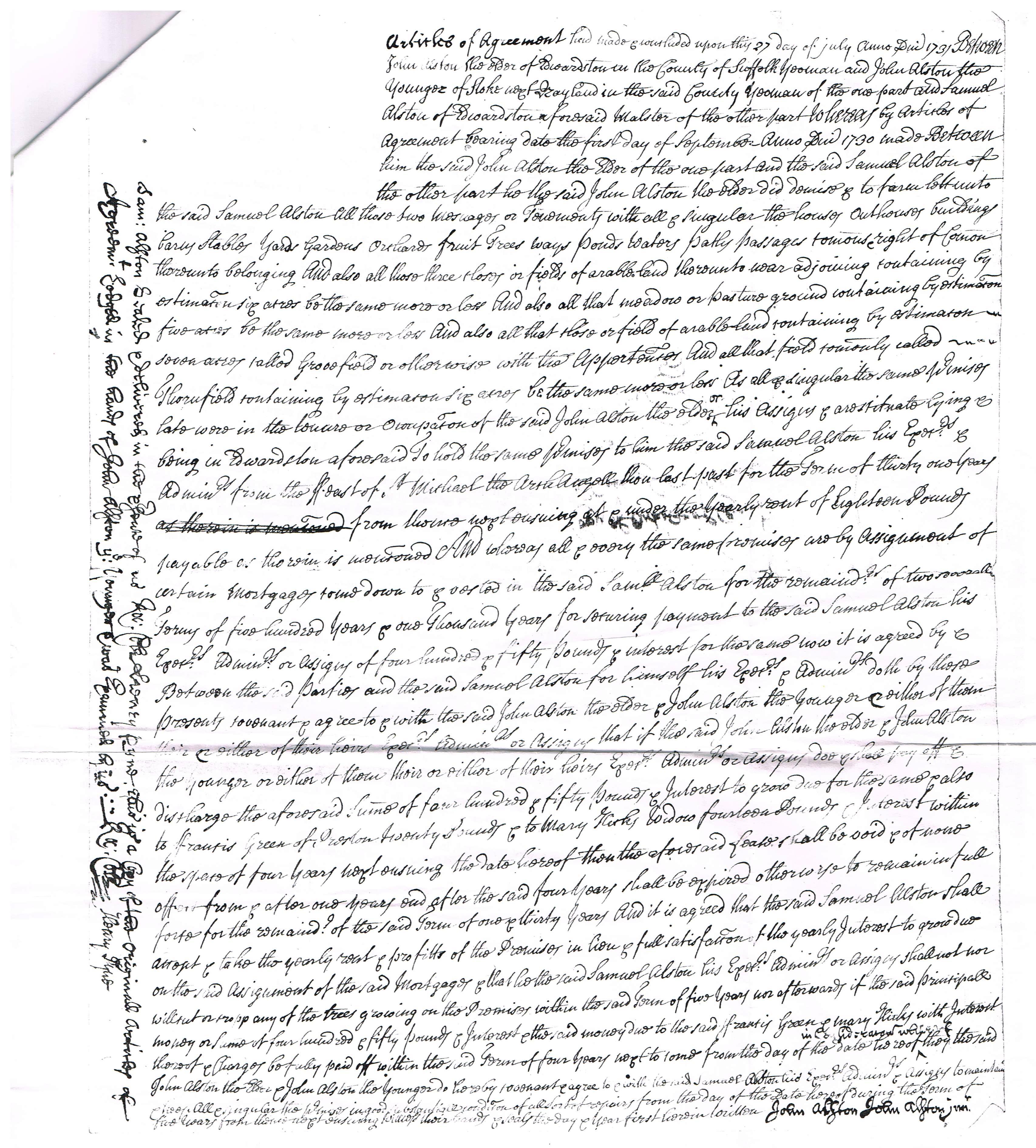 7. Agreement between John Alston the Elder & the Younger, 27 Jul 1731, Stoke By Nayland SFK. Articles of Agreement here made and concluded upon this 27th Day of July Anno Dui 1731 BETWEEN John Alston the Elder of Edwardstone in the County of Suffolk Yeoman and John Alston the younger of Stoke near Nayland in the said County Yeoman of the one part and Samuel Alston of Edwardstone aforesaid Maltster of the other part WHEREAS by Articles of Agreement bearing the date the first day of September Anno Dui 1730 made between him the said John Alston the Elder of the one part and the said Samuel Alston of the other part he the said John Alston the Elder did demise and to lease [?] lett unto the said Samuel Alston all those two Messuages or Tenements with all and singular the houses and outhouses buildings barley stables gardens orchards fruit trees ways ponds waters paths passages tenure [?] & right of common thereunto belonging AND also all those three closes and fields of arable land thereunto near adjoining containing by estimation six acres be the same more or less AND also all that meadow or pasture ground containing by estimation five acres be the same more or less AND also all that close or field of arable land containing by estimation seven acres called Grovefield or otherwise with the appurtances AND all that field commonly called Thornfield containing by estimation six acres by the same more or less As all and singular the same premises late were in the tenure or occupation of the said John Alston the Elder or his Assigns and are situate lying and being in Edwardstone aforesaid To hold the same Premises to him the said Samuel Alston his Executors and Administrators from the feast of St Michael the Arch Angel thou last passed for the Term of 31 years from (as therein is promised - struck out) from thence forth [?] ensuing at & under the yearly rent of eighteen pounds payable as herein is mentioned AND whereas all & every the same premises are by assignment of certain mortgages passed down to and vested in the said Samuel Alston for the remainder of two & several [?] Terms of five hundred years and one thousand years for securing payment to the said Samuel Alston his Executors and Administrators or Assigns of four hundred and fifty pounds and interest for the same now it is agreed by and between the said parties and the said Samuel Alston for himself his Executors and Administrators & Assigns doth by these presents covenant and agree to and with the said John Alston the Older and John Alston the younger or either of them their or either of their heirs ExEcutors Administrators or Assigns that if the said John Alston the Older and John Alston the younger or either of them their or either of their Heirs Executors Administrators or Assigns do and shall pay off and discharge the aforesaid sum of four hundred and fifty pounds and interest to grow [?] due for the same and also to Francis Green of Preston twenty pounds and to Mary Kirks widow fourteen pounds and interest within the space of four years next ensuing the date hereof then the aforesaid Lease shall be void and of nowe effect from and after one years end after the said four years shall be expired otherwise to remain in full force for the remainder of the said term of one and thirty years.AND it is agreed that the said Samuel Alston shall accept and take the yearly rent and proffits of the premises in leiu of full satisfaction of the yearly interest to grow due on the said assignment of the said mortgages and he the said Samuel Alston his Executors Administrators or Assigns shall not nor will cut or cropp any of the trees growing on the premises within the said term of five years nor afterwards if the said principle money or sum of four hundred and fifty pounds and interest and the said money due to the said Frances Green and Mary Kirks with interest thereof and charges be fully paid off within the said term of four years next to come from the day of the date hereof in . . . . . whereof the said John Alston the Elder and John Alston the younger hereby covenant and agree and with the said Samuel Alston his Executors Administrators and Assigns maintain and keep all and singular the premises in good substance and condition of all sort of repairs from the day of the date hereof during the term of five years from there next ensuing. Witness their hands and seals the day and year first herein written. John Alston. John Alston Jnr. Sam Alston signed and delivered in the presence of us R. Cole Henry Pyne this is a copy of the origional Articles of Agreement lodged in the hands of John Alston ye younger and was examined by us R Cole Henry Pyne. (in whose hand it is) Ref. Bury RO 391/6/2 (2001)