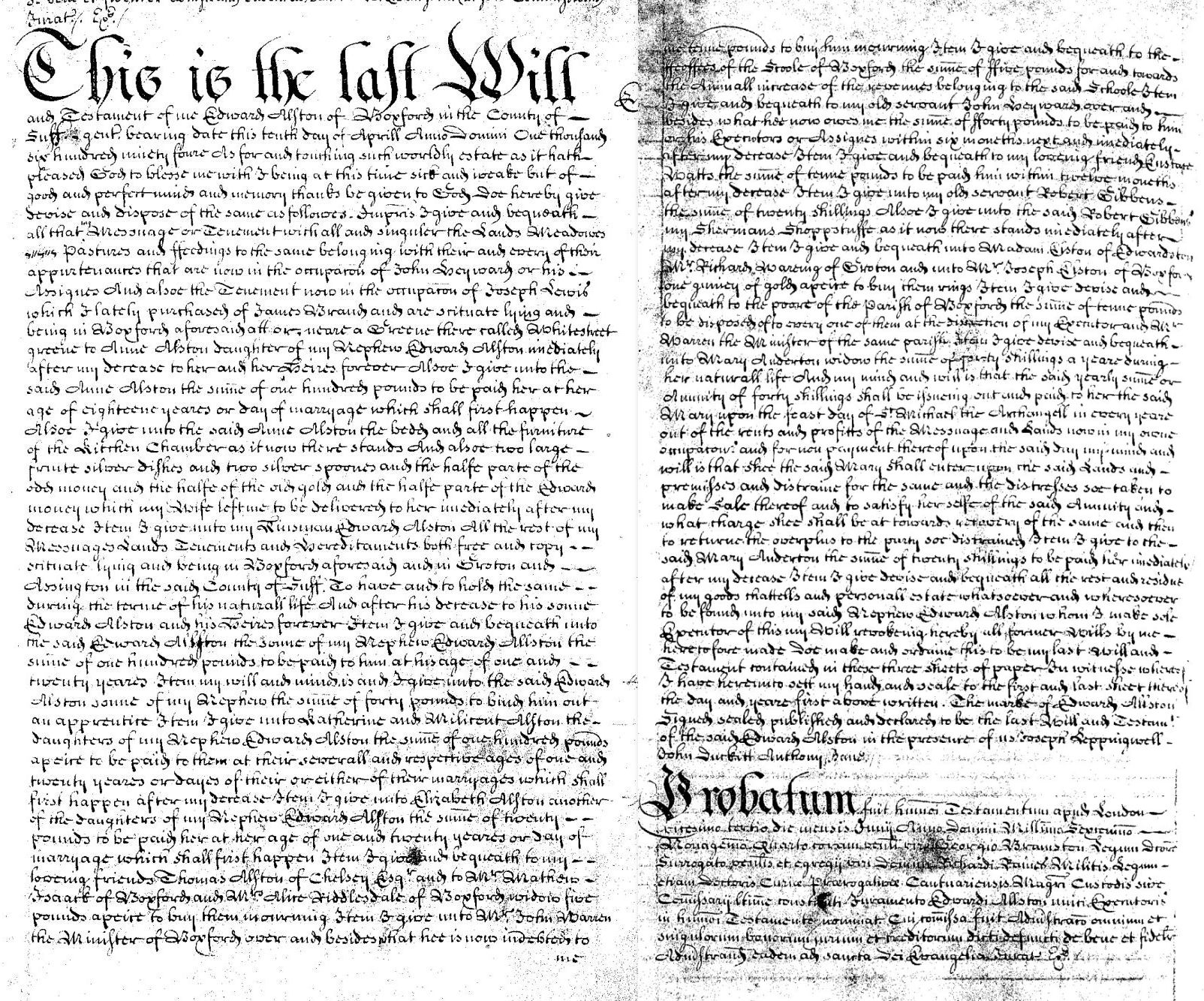 2. Edward Alston: Will, 1694, Boxford. THE WILL of EDWARD ALLSTON of BOXFORD Dated 10 April 1694 The will of Edward Allston of Boxford co. Suffolk gent. I give to Anne Alston and her heirs daughter of my nephew Edward Alston a messuage or tenement with the lands, and appurtenances thereto belonging, also another tenement in Boxford, also the sum of L100 the bed and all the of Boxford furniture of the kitchen chamber as it now stands, two large fruit silver dishes, 2 silver spoons, half of the odd money, half of the old gold, half of the Edward money which my wife left me. I give to my kinsman Edward Alston all the rest of my messuage, lands, tenement, and hereditaments in Boxford, Groton and Assington co. Suffolk with remainder to his son and his heirs, also to said Edward, son of my nephew Edward Alston L100 also L40 to bind him apprentice I give to Katherine and Milicent Alston daughters of my nephew Edward L100 each to Elizabeth another daughter of said Edward L20 to Thomas Alston of Chelsey Esq. L5 for mourning to Mr. Mathew Isaack of Boxford my loving friends L5 for mourning to Mrs. Alice Riddlesdale of Boxford widow L5 for mourning to Mr. John Warren Minister of Boxford L10 for mourning to the feoffees of the school of Bedford L5 to my old servant John Heyward L40 to my old servant Robert Gibbens 20/- also my Shermans shopstuff as it now stands to Madam Elston (Alston?) of Edwardston a guinea for rings to Mr. Richard Wareing of Groton a guinea for rings to Mr. Joseph Elston (Alston) of Boxford a guinea for rings the poor of Boxford L10 I give an annuity of 40/- to Mary Anderton also the sum of 20/- The residue of my property I give to my said nephew Edward Alston whom I make sole executor The mark of EDWARD ALLSTON Witnesses: Joseph Leppingwell, John Duckitt, Anthony Bane. Proved: 23 June 1694 by Edward Alston executor named in will. Page 126 Alstoniana. Cresswell ponders is this Edward, son of Thomas, second son of Edward Alston, of Sudbury and Edwardston [3189] Box 114 PROB 11/420/390 Full copy on this file