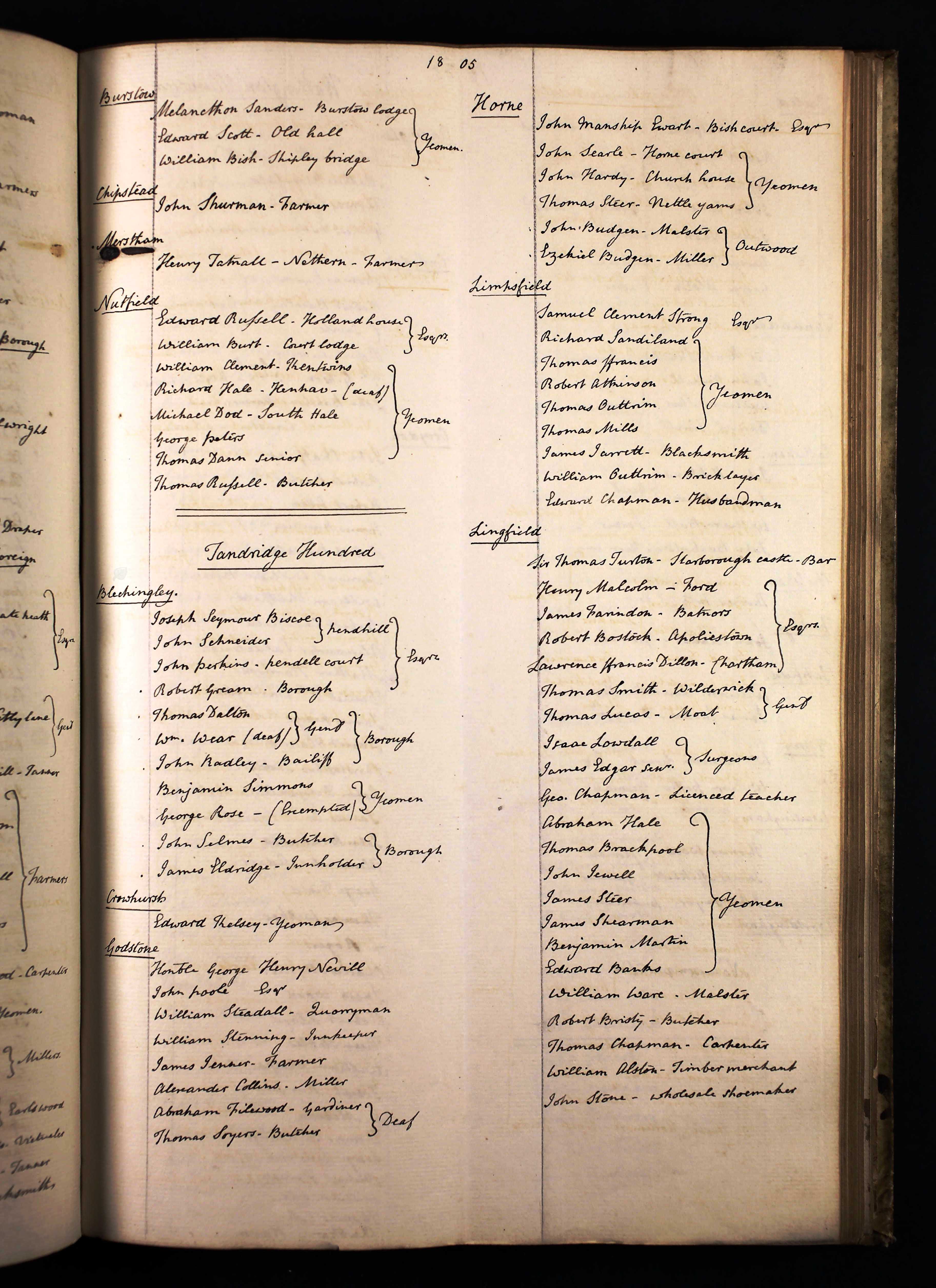 1. William Alston 8th Bt: Jury Qualified Land Owners, 1805, Lingfield. Recognition of Williams land 1805 he modestly describes himself as a timber merchant, not a Baronet.