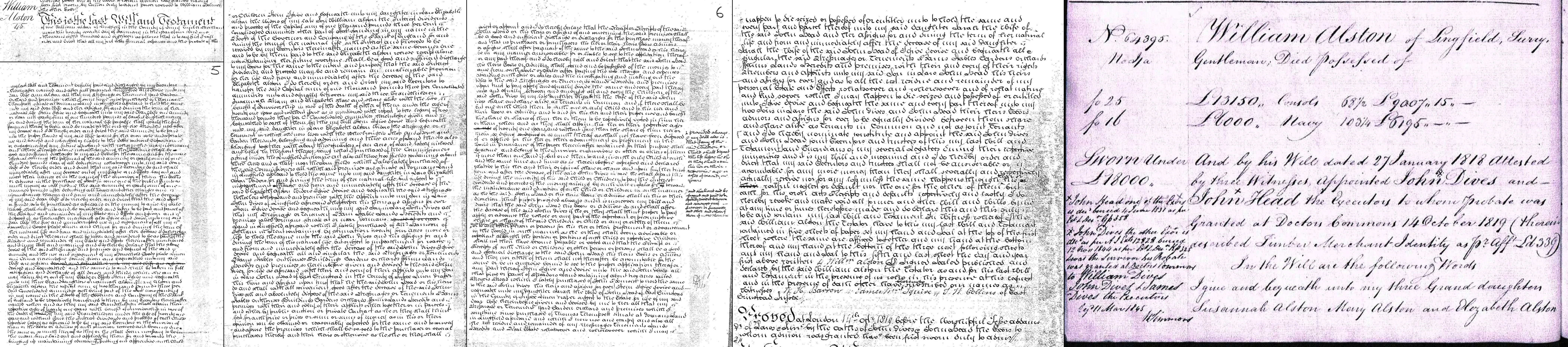 2. William Alston 8th Bt: Will, 27 Jan 1818, Lingfield. Will of William Alston. 27 Jan 1818 This is the last Will and Testament of me William Alston of Lingfield in the County of Surrey timber merchant made this 27th day of January in the year of our Lord one thousand eight hundred and eighteen as follows that is to say first I will order and direct that all my just debts funeral expenses and the probate of this my last will and testament be fully paid and discharged by my executors hereinafter named and after full payment and satisfaction I give and devise unto my dear Wife Ann Alston all that my messuage or tenement and garden orchard and premises which I some time since purchased of Thomas Thompsett situated at Domans Land in Lingfield aforesaid to hold the same unto my said dear Wife and her heirs and assigns for and during the term of her natural life Item I give and bequeath unto my said dear Wife one annuity or . . . . . nett yearly sum of one hundred pounds of lawful English money for and during the term of her natural life payable half yearly the first payment thereof to begin and be made at the end of six months next after my decease and I do here by order and direct the said annuity to be paid into the proper hands of my said Wife to and for her own sole and separate use and benefit and not subject or liable to the debts . . . . . disposition or engagements of any future husband with whom she may intermarry and whose receipts alone notwithstanding her future meantime shall be good and sufficient discharges to my said executors for the same and for the more effectual settling the participant of the said annuity or yearly sum of one hundred pounds clear of all deductions whatsoever unto my said dear Wife I do hereby order and direct that my said executors do and shall immediately after my decease out of my estate and effects layout and invest their names or in the names of the survivor of them his heirs or admonitions in the purchase of stock in some one of the public funds as much money as will produce the said annuity or yearly sum of one hundred pounds after deducting all taxes and other charges and encumbrances thereon and from and immediately after the decease of my said dear Wife I do hereby order and direct that the said stock or funds so to be purchased as aforesaid or the money to arise by sale thereof shall sink into and be consonant and taken to be part and parcel of the residue and remainder of my estate and effects and given and disposed of as hereinafter mentioned also I give and devise unto my said dear Wife the free and interrupted use and enjoyment of all my household goods plate linen and china for and during the term of her natural life and from and immediately after her decease I do hereby order and direct the said shall be taken and considered to be as part and parcel of the residue and remainder of my estate and effects hereinafter mentioned and it is my Will and I do hereby declare that the above devise of the said Messuages and premises and bequest of the said annuity and the use and enjoyment of my household goods plate linen and china therein before devised given and bequeathed unto my said Wife are so given devised and bequeathed and the same to and shall be taken in full satisfaction and discharge of all dower and things which she can or may claim by or out of my estate or effects Item I give and bequeath unto my three granddaughters Susannah Alston Mary Alston and Elizabeth Alston the capital sum of two thousand pounds three percent consolidated annuities each being part of the stock now standing in my name in the books of the Govenor and Company of the Bank of England to be respectively transferred to them by my executors hereinafter named when and as they my said grandchildren shall attain their respective ages of twenty one years with benefit of survivorship in case of the death of either of my said grandchildren under the age of twenty one years and without issue the interest dividends and proceeds of each child's respective (gain) as aforesaid to be by my said executors or the survivor of them or the executors or administrators of such survivor received as it becomes due the same or so much thereof as they or he shall deem necessary to be in the meantime paid out and applied by them for and towards the bringing up maintaining educating and putting out apprentice such child or children Item I give and bequeathed unto my daughter in law Elizabeth Alston the widow of my late son William Alston the interest dividends and proceeds of the capital sum of one thousand pounds three percent consolidated annuities of her part of stock standing in my name in the books of the Governor and company of the Bank of England for and during the term of her natural life with interest and proceeds to be received by my executors hereinafter named as the same becomes due and to be by them paid to the said Elizabeth Alston whose receipt alone not withstanding her future meantime shall be a good and sufficient discharge to my executors for the same to the interest and purpose that the said interest dividends and proceeds may be and remain an unalienable provision for her life and from and immediately after the decease of the said Elizabeth Alston I do hereby order and direct my said executors to transfer the said capital sum of one thousnad pounds at three percent consolidated annuities into and actually between my said three grandchildren Susannah Mary and Elizabeth share and share alike with the life benefit of survivorship in case of the death of either of them under the age of twenty one years and without issue as is mentioned with respect to the legacy of two thousand pounds at three percent consolidated annuities hereinbefore given and bequeathed to each of them by this my will. Item I give devise and bequeath unto my said daughter-in-law Elizabeth Alston widow the Messuages or tenement in which she now lives with the warehouse? shop and house and garden thereunto 