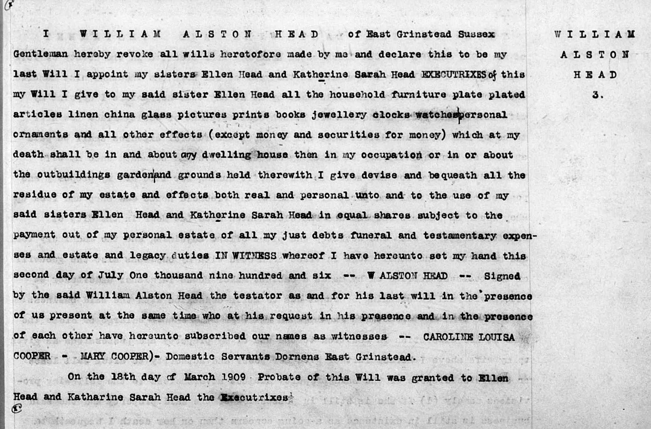 5. William Alston Head: Will, 1909, East Grinstead SSX. I WILLIAM ALSTON HEAD of East Grinstead Sussex Gentleman hereby revoke all Will heretofore made by me and declare this to be my last Will I appoint, my sisters Ellen Head and Katherine Sarah EXCUTRIXES of this my Will I give to my said sister Ellen Head all the household furniture plate plated articles linen china glass pictures prints books jewellery clocks. watches and personal ornaments and all other effects (except money and securities for money) which at my death shall be in and about my dwelling house than in my occupation or in or about the outbuildings gardens and grounds held therewith I give devise and bequeath all the residue of my estate and effects both real and personal unto and to the use of my said sisters Ellen Head and Katherine Sarah Head in equal shares subject to the payment out of my personal estate of all my just debts funeral and testamentary expenses and estate and legacy duties IN WITNESS whereof I have hereunto set my hand this second day of July one thousand nine hundred and six. W ALSTON HEAD Signed by the said William Alston Head the testator as and for his last will in thepresence of us present at the same time who at his request in his presence and in the presence of each other have hereunto subscribed our names as witnesses: CAROLINE LOUISA COOPER & MARY COOPER: Domestic Servants Dormens East Grinstead. On the 18th day of March 1909 Probate of this Will was granted to Ellen Head and Katharine Sarah Head the Executrixes.