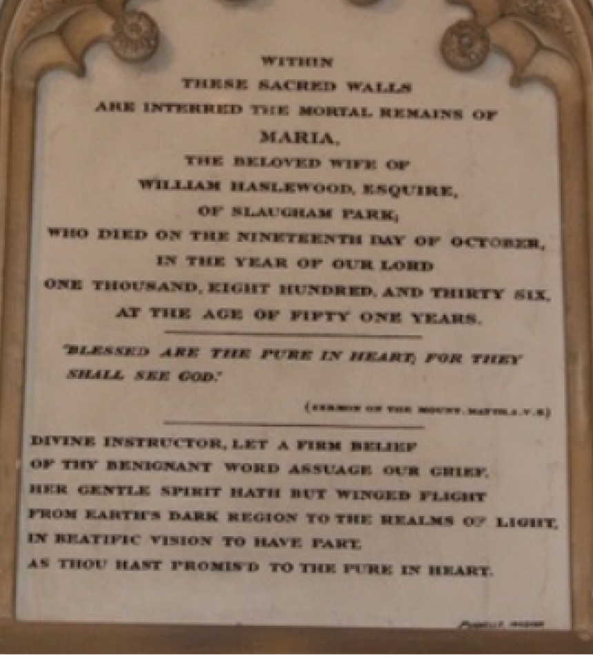 1. Memorial to Maria Godsal, 1836, St Mary Slaugham SSX. Maria married William HASLEWOOD [22132] [MRIN: 7951], son of Thomas HASLEWOOD [34743] and Jane DAVIES [34744], on 8 Mar 1803 in St George Hanover Sq. (William HASLEWOOD [22132] was born on 24 Feb 1774 in Slaugham Park SSX and died on 11 Apr 1849 in Brighton SSX.) |