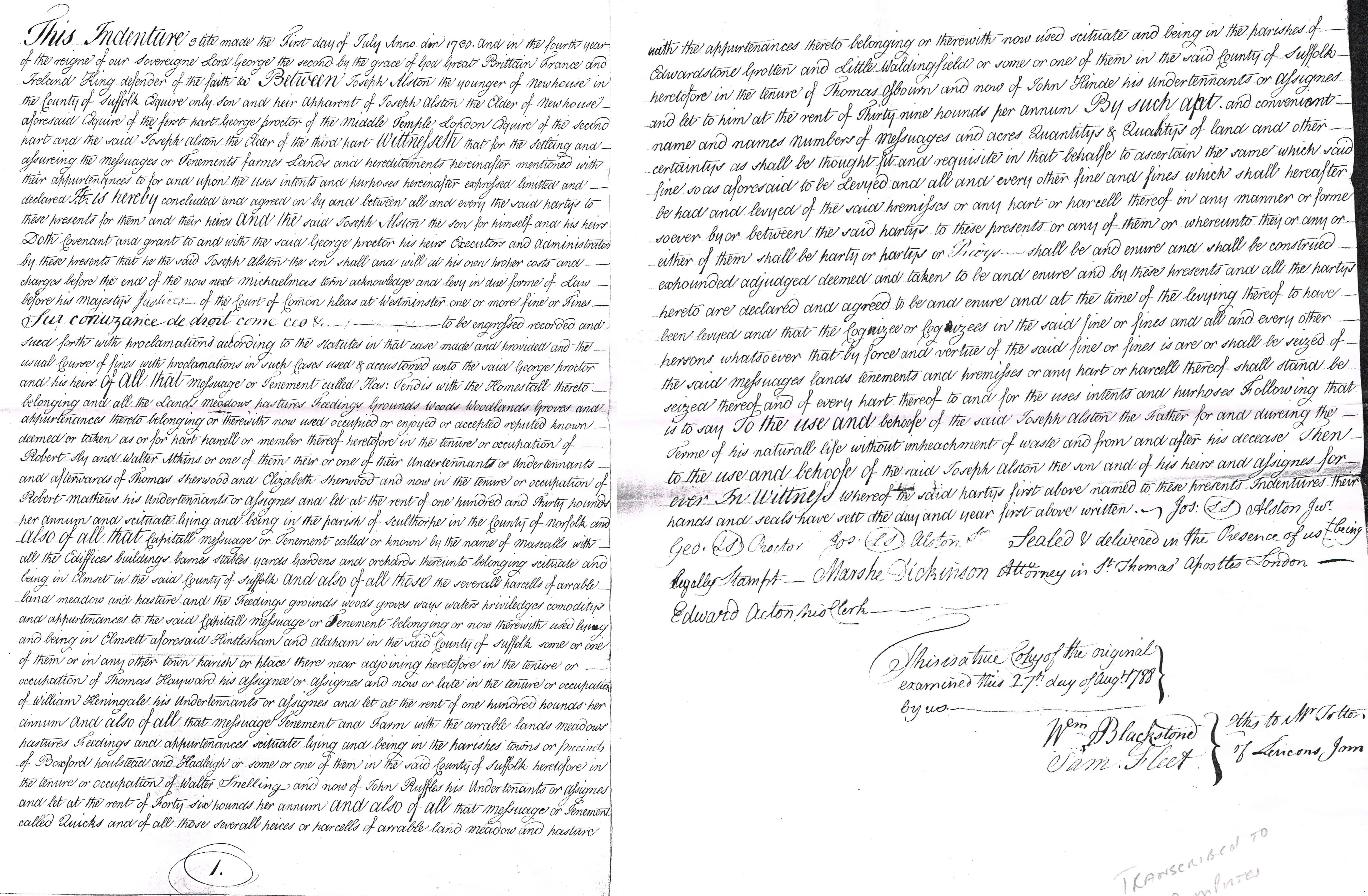 1. Joseph Alston Jnr of New House: Indenture George Proctor & Joseph Alston Snr, 1 Jul 1730. This Indenture 3 tite made the first day of July 1730 and in the fourth year of the reigne of our Sovereign Lord George II by the Grace of God Great Britain France and Ireland King defender of the Faith etc. Between Joseph Alston the younger of Newhouse in the County of Suffolk Esq., only son and heir apparent of Joseph Alston the elder of Newhouse aforesaid Esq., of the first part George Proctor of the Middle Temple London Esq., of the second part and the said Joseph Alston the elder of the third part Witnesseth that for the settling an assuring the messuages or tenements farms lands and hereditaments hereinafter mentioned with their appurtenances to for and upon their use intents and purposes hereinafter expressed limited and declared It Is Hereby concluded and agreed on by and between all and every the said partys to these presents for them and their heirs And The said Joseph Alston the son for himself and his heirs Doth Covenant and grant to and with the said George Proctor his heirs Executors and Administrators by these presents that he the said Joseph Alston the son shall and will at his own proper costs and charges before the end of the now next Michaelmas term acknowledge and levy in due forme of Law before his Majesty's Justices of the Court of Common and Pleas at Westminster one or more fine or fines Sur Conuzance de droit come ceo etc to be engrossed recorded and sued forth with proclamations according to the statutes in that case made and provided and the usual course of fines with proclamations in such cases used and accustomed unto the said George Proctor and his heirs Of All that messuage or tenement called Has Tendis with the Homestall thereto belonging and all the lands Meadows pastures Feedings grounds Woods woodlands Groves and appurtenances thereto belonging or therewith now used occupied or enjoyed or accepted reputed known deemed or taken as or for part parcel or member thereof heretofore in the tenure or occupation of Robert Sly and Walter Atkins or one of them their or one of their undertenant or undertenants and afterwards of Thomas Sherwood and Elizabeth Sherwood and now in the tenure or occupation of Robert Matthews is undertenants or assigns and let at the rent of 130 pounds per annum and situate lying and being in the parish of Scunthorpe in the County of Norfolk and Also of all that capital messuage or tenement called all known by the name of Mascalls with all the edifices buildings barns stables Yards gardens and orchards thereunto belonging to situate and being in Elmset in the said County of Suffolk And also of all those the several parcells of arable land meadow and pasture and the feedings grounds woods groves ways waters privileges commoditiys and appurtenances to the said capital messuage or tenement belonging or now therewith used lying and being in Elmset aforesaid Hintlesham and Aldham in the said County of Suffolk some or one of them or in any other town parish or place there near adjoining heretofore in the tenure or occupation of Thomas Hayward his assignee or assignes and let at the rent of 100 pounds per annum And also of all that messuage tenement and farm with the arable lands meadows pastures feedings and appurtenances situate lying and being in the parishes towns all precincts of Boxford Poulstead and Hadleigh or some or one of them in the said County of Suffolk heretofore in the tenure or occupation of Walter Snelling and now of John Ruffles is undertenants or assigns and let at the rent of 46 pounds per annum And also of all that messuage or tenement called Quicks and of all those several pieces or parcels of arable land meadow and pasture with the appurtenances thereto belonging or therewith now used situate and being in the parishes of Edwardstone Grotten and Little Waldingfield or some or one of them in the said County of Suffolk heretofore in the tenure of Thomas Asbourn and now of John Hinde is undertenants or assigns and let to him at the rent of 39 pounds per annum By such apt and convenient name and names numbers of messuage and acres quantities and qualities of land and other certaintys as shall be thought fit and requisite in that behalfe to ascertain the same which said fine so as aforesaid to be levyed and all and every other fine and fines which shall hereafter be had and levyed of the said premises or any part or parcel thereof in any manner or forme soever by or between the said partys to these presents or any of them or whereunto they or any or either of them shall be party or partys or Privys shall be and enure and shall be construed expounded adjudged deemed and taken to be and enure and at the time of the levying thereof to have been levyed and that the Cognizee or Cognizees in the said fine or fines and all and every other persons whatsoever that by force and vertue of the said fine or fines is are or shall be seized of the said messuage lands tenements and premises or any part or parcel thereof shall stand be seized thereof and of every part thereof to and for the uses in intents and purposes following that is to say To the use and behoofe of the said Joseph Alston the father for and during the term of his natural life without impeachment of waste and from and after his decease Then to the use and behoofe of the said Joseph Alston the son and on his heirs and assigns for ever In Witness whereof the said partys first above named to these presents indentures their hands and seals have the day and year first above written. Jos(LS)Alston Jnr Geo(LS)Proctor Jos(LS)Alston Snr Sealed and delivered in the presence of us being legally Stampt - Marshe Dickenson attorney in St Thomas Apostles London Edward Acton his Clark. This is a true copy of the original examined this 27th day of August 1788 by us: William Blackstone Sam Fleet clerks to Mr Totton of Lincoln's Inn. Bury R.O. 391/9.