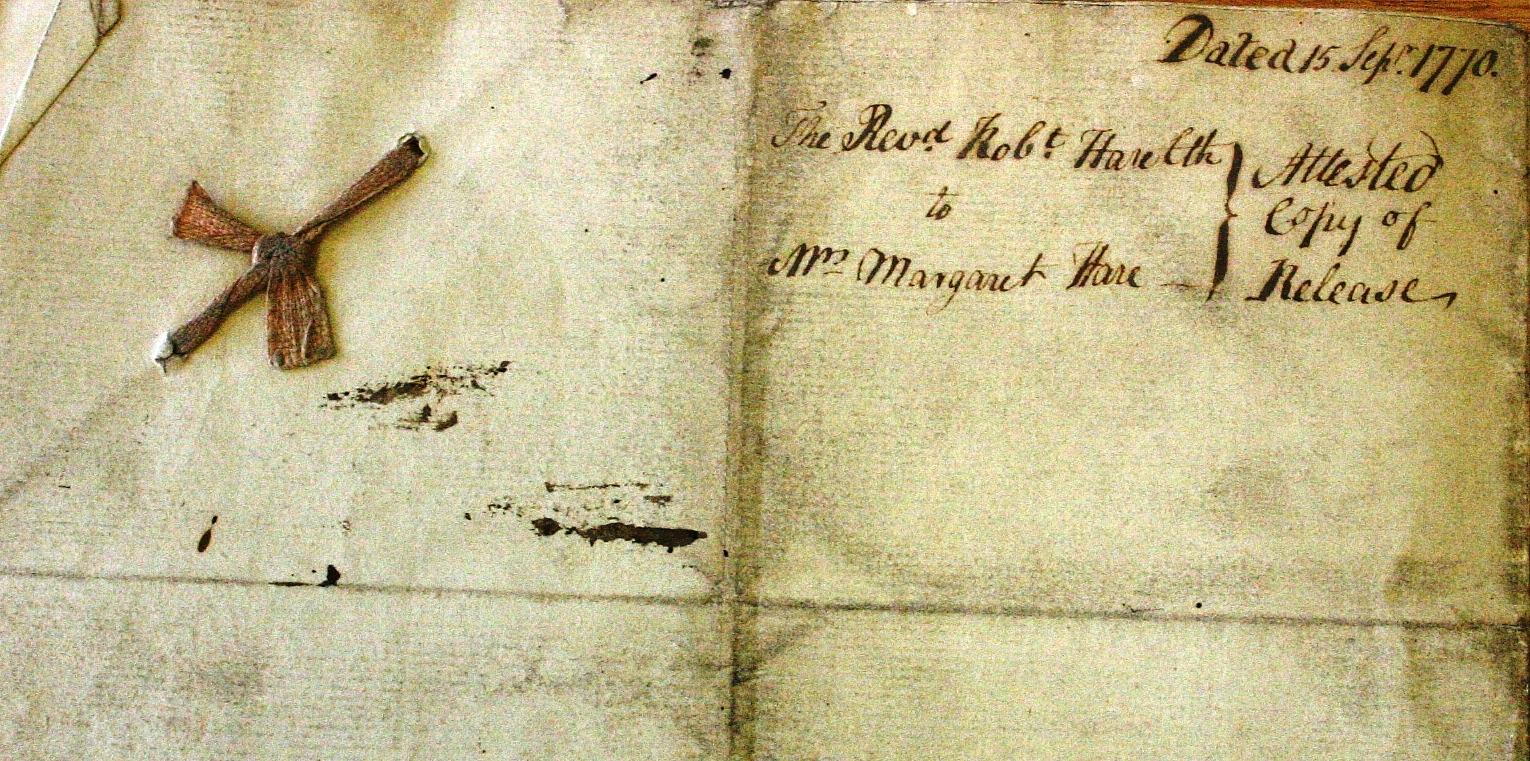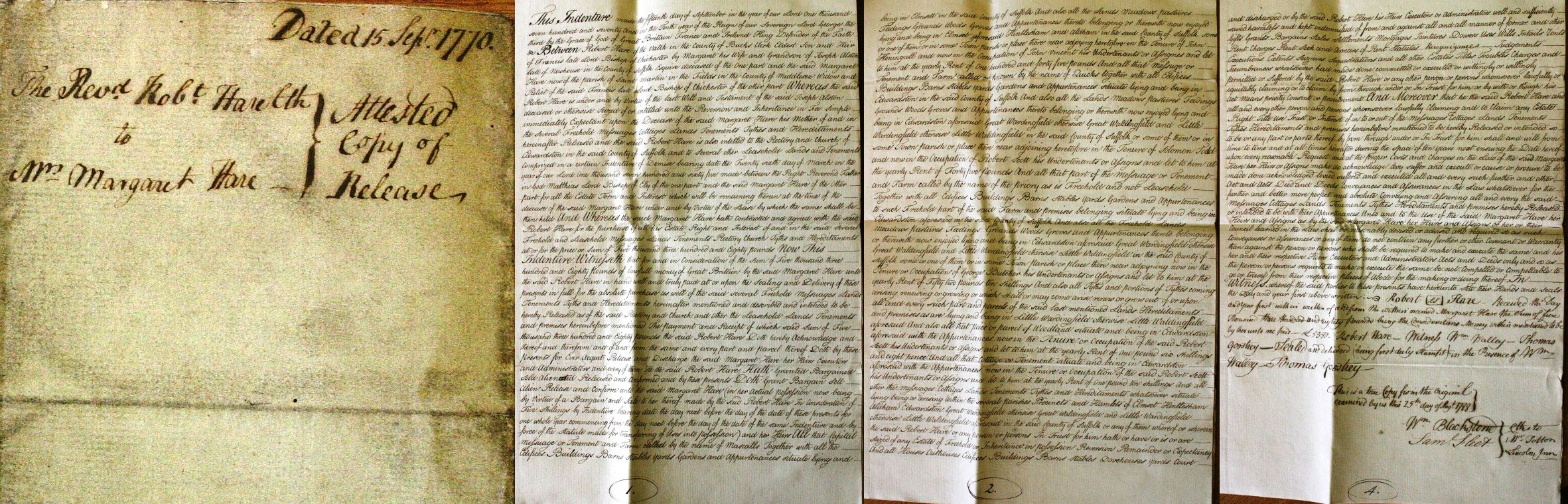 2. Release: Robert Hare to Margaret Hare, 15 Sep 1770. This Release Indenture relates to the lease between Robert Hare and his mother Margaret dated 14 Sep 1770, summarised above. As page 3 of this MSS is missing it has not been transcribed.