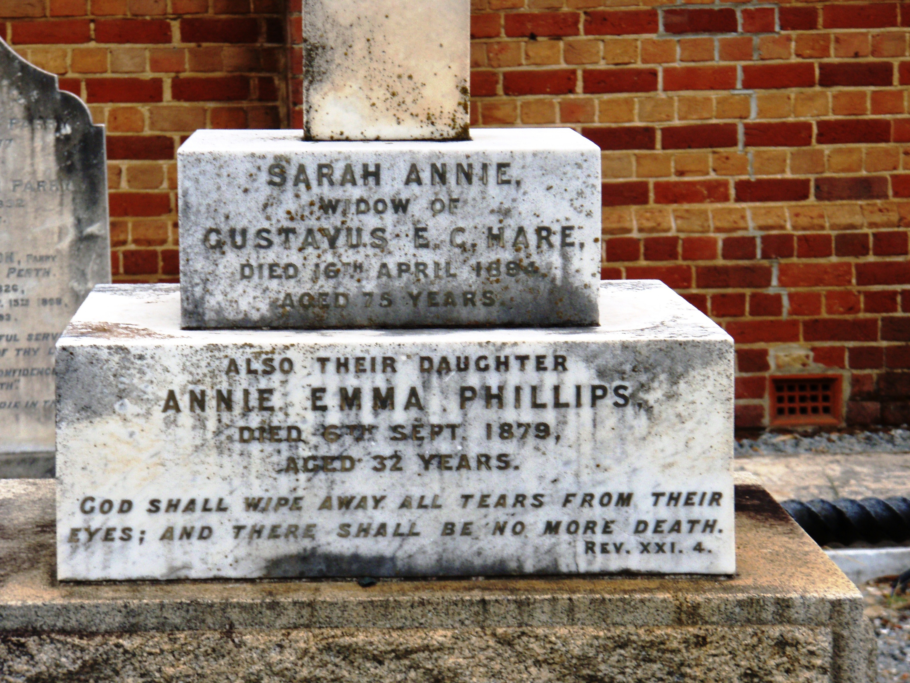 Deaths WE regret to record the death of Mrs. Sarah Hare, which took place at her residence in. Adelaide-terrace, at an early hour on Monday morning. The deceased lady was the widow of the late Mr. Gustavus Edward Cockburn Hare, who arrived in this colony in June of 1867 and who held the post of Superintendent of Police, and subsequently of Government Resident at Albany, succeeding in the latter office, the late Sir Alexander Cockburn Campbell, Bart. Mrs. Hare was a sister of the late General Charles von Wright, of the German Army, and a sister-in-law of Francis, Augustus, Marcus, and Archdeacon Hare. MCB. Hare, who, at the time of her death, was 75 years of age, had been ailing for some time up till recently. Her health then seemed to improve somewhat, and for her age she appeared strong. On Sunday morning, about three o'clock, however, she became suddenly ill, and a doctor was summoned, but about an hour afterwards she breathed her last. She leaves behind her four sons and three daughters, the eldest son being the Rev. Francis Hare, chaplain of Christ's College, New Zealand; the second, Mr. Frederick Hare, resident Magistrate, York; the third, Mr. Reginald Hare, Secretary to the West Australian Agency, London, and the youngest, Mr. E. G. S. Hare, solicitor, Perth. One daughter was married to Mr. S. Bart, Q.C., M.L.A., Attorney-General ; the second to Mr. O. Burt.. The under-Secretary, Colonial Secretary's Department; and the third to Mr, Pembroke-Jones, C.E., Buenos Ayres. Ref; Trove Western Mail (Perth, WA : 1885 - 1954) Saturday 21 April 1894
