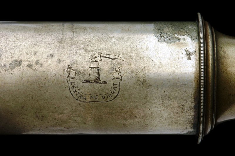 The Hand crest is the emblem of an arm with a sword in its hand above the motto 'Dextra me vibrat' - Brandished in my right hand.