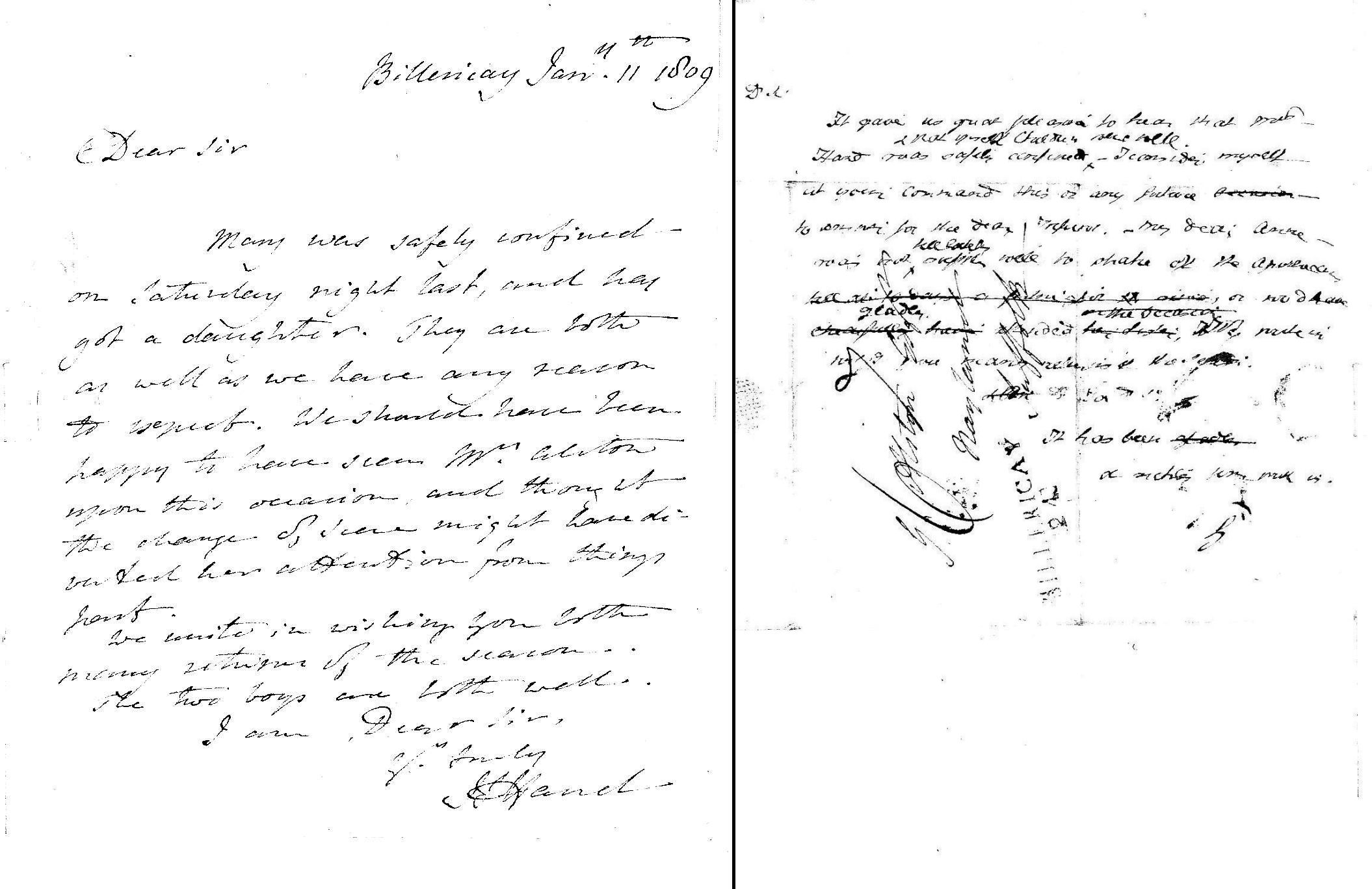 1. John Staples Hand: Letter to George Alston re birth of Maria Hand, 11 Jan 1809. Billericay Jan 11th 1809 Dear Sir, Mary was safely confined on Saturday night last, and has got a daughter. They are both as well as we have any reason to expect. We should have been happy to have seen Mrs Alston upon this occasion and thought the change of scene might have diverted her attention from things past. We write in wishing you both many returns of the season. The two boys are both well. I am Dear Sir, Yours truly J S Hand