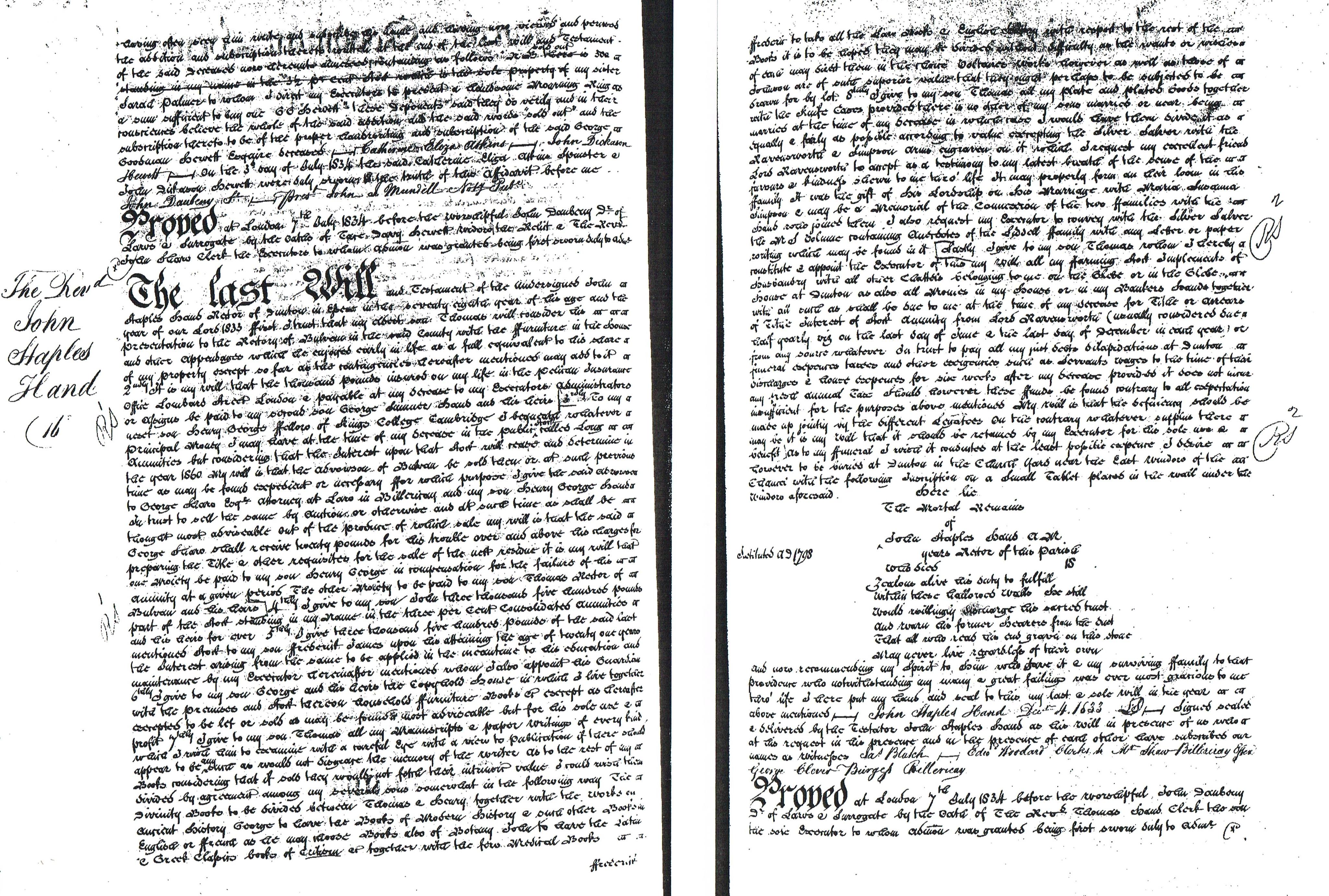 2. John Staples Hand: Will, 4 Dec 1833, Dunton ESS. Will of John Staples HAND Rector of Dunton 4 Dec 1833 The last will and Testament of the undersigned John Staples Hand Rector of Dunton in Essex in the seventy eighth year of his age the year of our Lord 1833. First I trust that my oldest son Thomas will consider the presentation to the Rectory of Bulvan in the said County with the furniture in the house and other appendages which he enjoyed early in life as a full equivalent to his share of my property except so far as the contingencies hereafter mentioned may add to it. 2ndly it is my will that the thousand pounds insured on my life in the P. . . . . [Pelican?] Insurance Office Lombard Street London and payable at my decease to my Executors Administrators or Assigns be paid to my second son George Sumner Hand and his heirs. 3rdly to my next son Henry George Fellow of Kings College Cambridge I bequeath whatever Principal Money I may have at the time of my decease in the Public Stock called Long Annuities but considering that the Interest upon that Stock will cease and determine in the year 1860 my will is that the advowson of Bulvan be sold then or at such previous time as may be found expedient or necessary for which purpose I give the said advowson to George Shaw Esq Attorney at Law in Billericay and my son Henry George Hand in trust to sell the same by Auction or otherwise and at such time as shall be thought most advisable out of the product of which sale my will is that the said George Shaw shall receive twenty pounds for his trouble over and above his charges for preparing the Title and other requisites for the sale of the nett residue is it my will that a moiety be paid to my son Henry George in compensation for the failure of his annuity at a given period. The other moiety to be paid to my son Thomas Rector of Bulvan and his heirs. 4thly I give to my son John three thousand five hundred pounds part of the Stock standing in my name in the three per cent Consolidated Annuities and his heirs for ever. 5thly I give three thousand five hundred pounds of the said last mentioned stock to my son Frederick James upon his attaining the age of twenty one years the Interest arising from the same to be applied in the meantime to his education and maintenance by my Executor hereinafter mentioned whom I also appoint his Guardian. 6thly I give to my son George and his heirs the copyhold house in which I live together with the premises and stock thereon household furniture books etc except as hereafter excepted to be let or sold as may be found most advisable but for his sole use and profit. 7thly I give to my son Thomas all my Manuscripts and paper writing of every kind which I wish him to examine with a careful eye with a view to publication if there should appear to be any such as would not disgrace the memory of the writer. As to the rest of my books considering that if sold they would not fetch their int….[intrinsic?] value I would wish them divided by agreement among my several sons somewhat in the following way. The Divinity Books to be divided between Thomas and Henry together with the works on Ancient History. George to have the Books of Modern History and such other Books English of French as he may choose Books also of Botany. John to have the Latin and Greek Classics books of . . . . . etc together with the few Medieval Books. Frederick to take all the Law Books and Englis. . . . . . [History? - too dark] with respect to the rest of the Books it is to be hoped they may be divided without difficulty as the wants or wishes of such may desire [?] them in the choice Voltaires works however as well as those of Johnson are of such superior value that they ought perhaps to be subjected to be drawn for by lot. 8thly I give to my son Thomas all my plate and plated Goods together with the knife cases provided there is no other of my sons married or near being married at the time of my decease in which case I would have them divide it as equally and fairly as possible according to value excepting the Silver Salver with the Ravensworth and Simpson arms engraven on it which I request my excellent friend Lord Ravensworth to accept as a testimony to my latest . . . . . of the sense of the favours and kindness shown to me thro' life. It may properly form an heir loom in his family. It was the gift of His Lordship on his marriage with Maria Susanna Simpson and may be a Memorial of the connection of the two families with the [Hand?] who joined them. I also request my Executor to convey with the Silver Salver the Nr. 8 Volume containing anecdotes of the Liddell family with any Letter of paper writing which may be found in it. Lastly I give to my son Thomas whom I hereby constitute and appoint the Executor of this my will all my farming stock implements of husbandry with all other chattels belonging to me or the Glebe or in the Glebe House at Dunton as also all monies in my house or in my Bankers Hands with all such as shall be due to me at the time of my decease for Tithe or arrears of Tithe Interest of Stock Annuity from Lord Ravensworth (usually considered due half yearly viz on the last day of June and the last day of December in each year) or from any source whatever. In trust to pay all my just debts dilapidations at Dunton funeral expenses taxes and other exigencies such as Servants wages to the time of their discharges and house expenses for six weeks after my decease provided it does not incur any . . . . . annual tax. Should however these funds be found contrary to all expectation insufficient for the purposes above mentioned my will is that the deficiency should be made up jointly by the different Legatees. On the contrary whatever surplus there may be it is my will that it should be retained by my Executor for his sole use and benefit. As to my funeral I wish it conducted at the least possible expense. I desire however to be buried at Dunton in the Church Yard near the East Window of the 